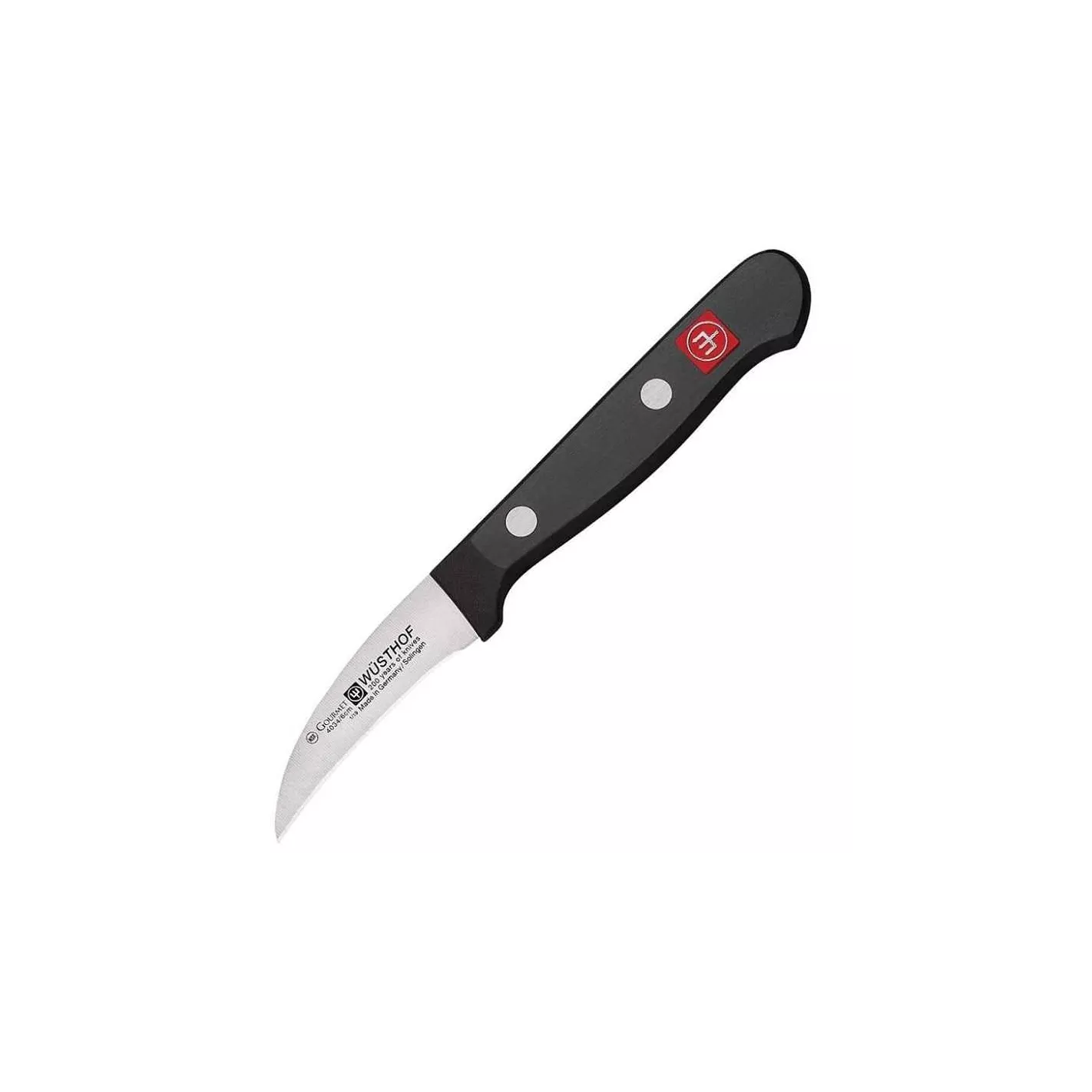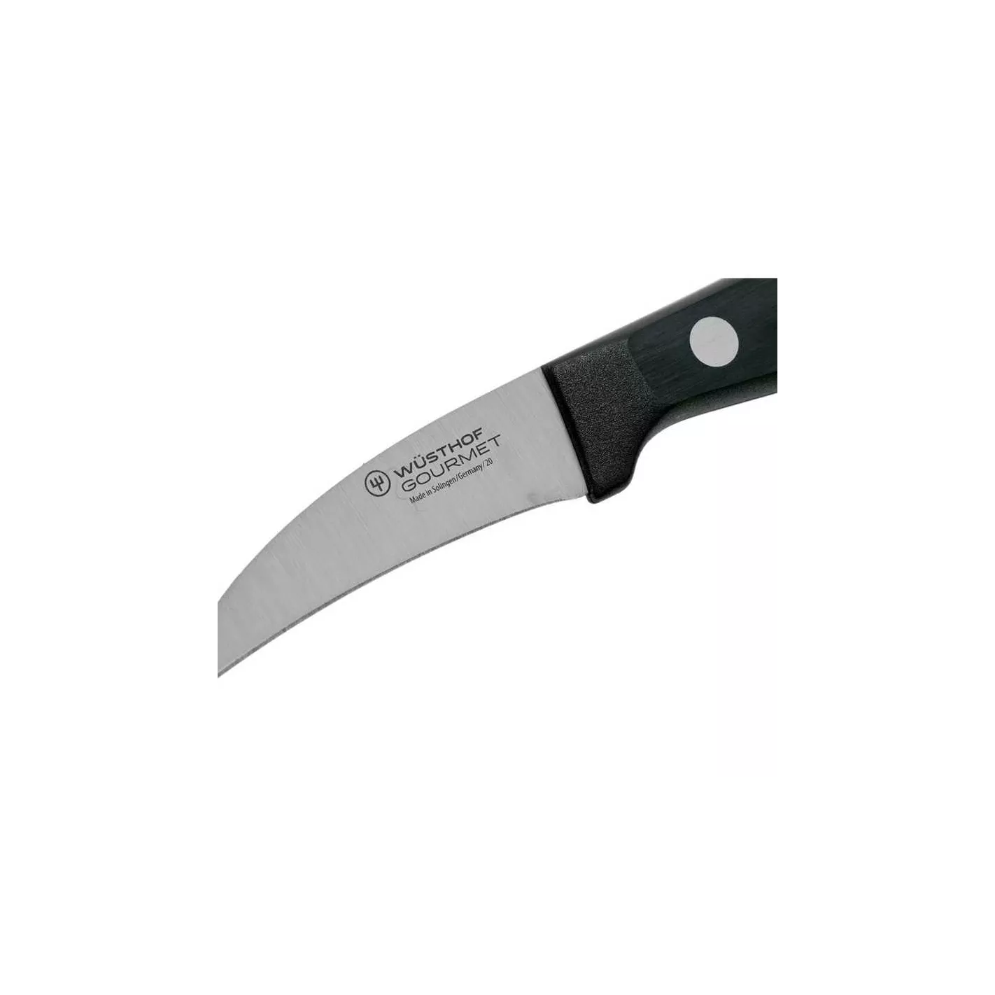 Especialmente útil para pelar y limpiar frutas y verduras de forma redondeada: este pequeño y práctico cuchillo pelador, también conocido como cuchillo de tornear, con su hoja corta y curvada en forma de pico de pájaro, permite pelar rápidamente productos como patatas o manzanas, conservando las valiosas vitaminas que se encuentran directamente debajo de la piel.
