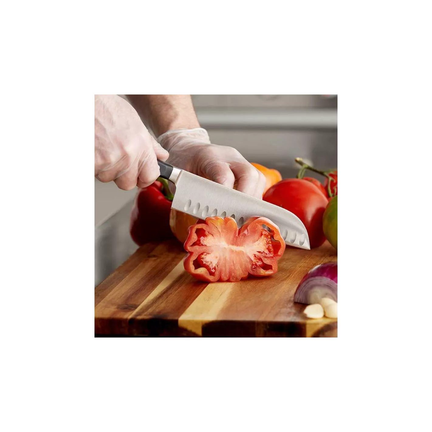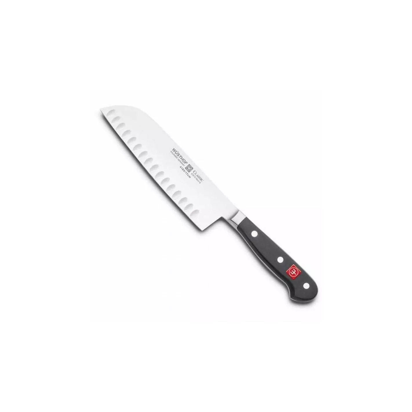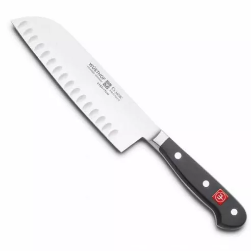 Cuchillo especial de 17 centímetros con diseño Santoku, cumple las 3 funciones importantes rebanado, cortar y picar. Gracias a su diseño Santoku el filo del cuchillo será bastante duradero.