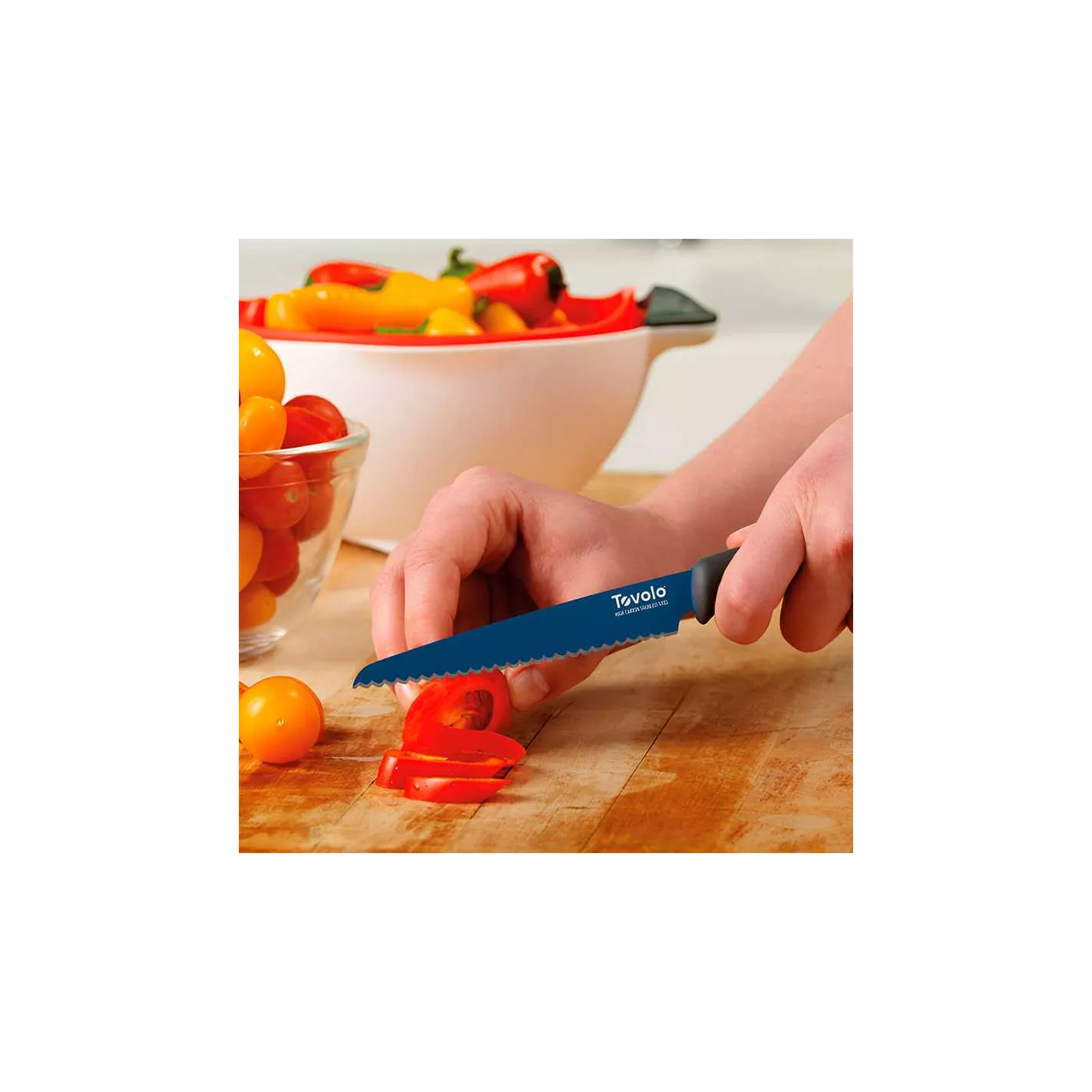 Usa este cuchillo compacto para cortar bagels, tomates, aguacates, frutas, verduras y panes. La hoja dentada corta fácilmente panes duros y pieles delicadas de productos sin aplastar la fruta que se encuentra debajo. Mangos contorneados para un agarre seguro, lo que hace que estos cuchillos sean perfectos para pelar y cortar frutas y verduras en cubitos. El mango ergonómico hace que el cuchillo sea cómodo en la mano y el agarre antideslizante facilita el manejo de cortes difíciles.