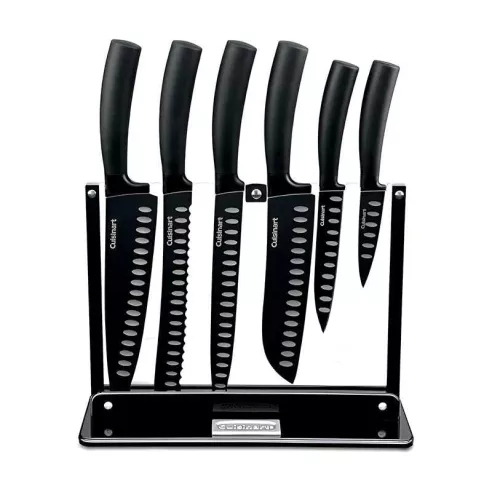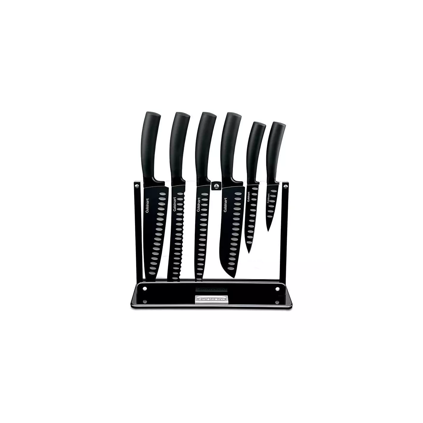 Este juego de 7 piezas de la colección de borde antiadherente incluye 7 diferentes cuchillos: un cuchillo de chef de 8 pulgadas, cuchillo de pan dentado de 8 pulgadas, cuchillo de tallar de 8 pulgadas, cuchillo Santoku de 7 pulgadas, cuchillo utilitario de 5 pulgadas, cuchillo de pelar de 3.5 pulgadas, así como el soporte acrílico.