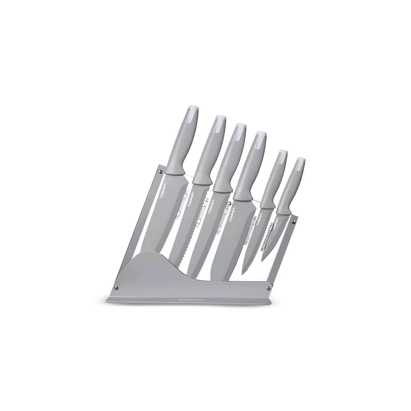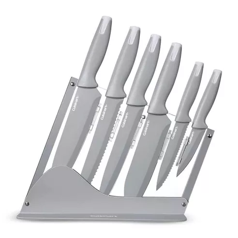 Cuidadosamente equipadas con cuchillas de acero inoxidable, están perfectamente equilibradas y formadas para una multitud de tareas de cocina. El juego incluye: 8" cuchillo de chef 8" 8" cuchillo de rebanar 8" cuchillo de pan 7" cuchillo Santoku cuchillo 5.5" cuchillo de utilidad dentado 3.5" cuchillo de pelar y una base acrílica.