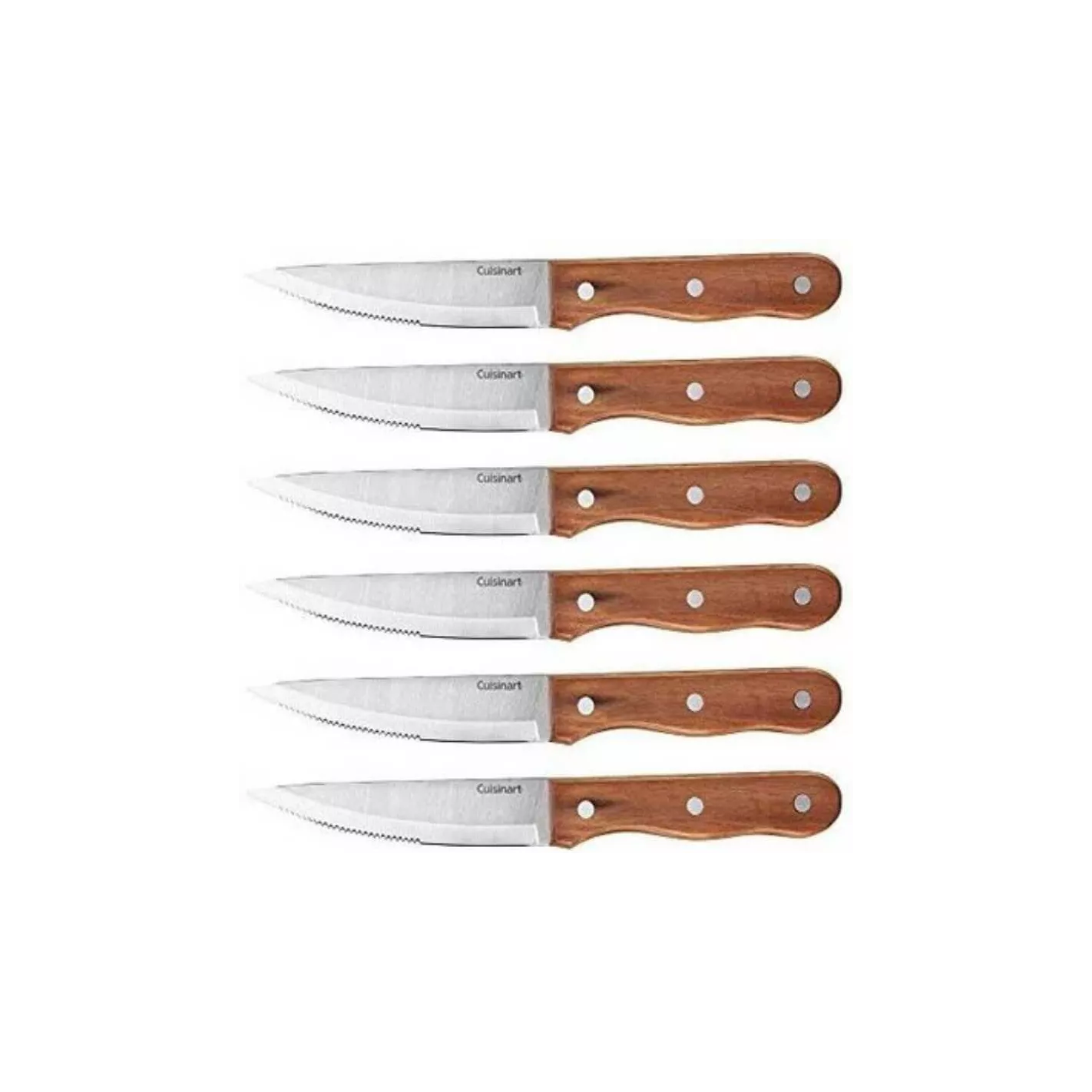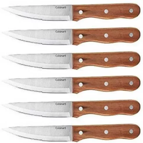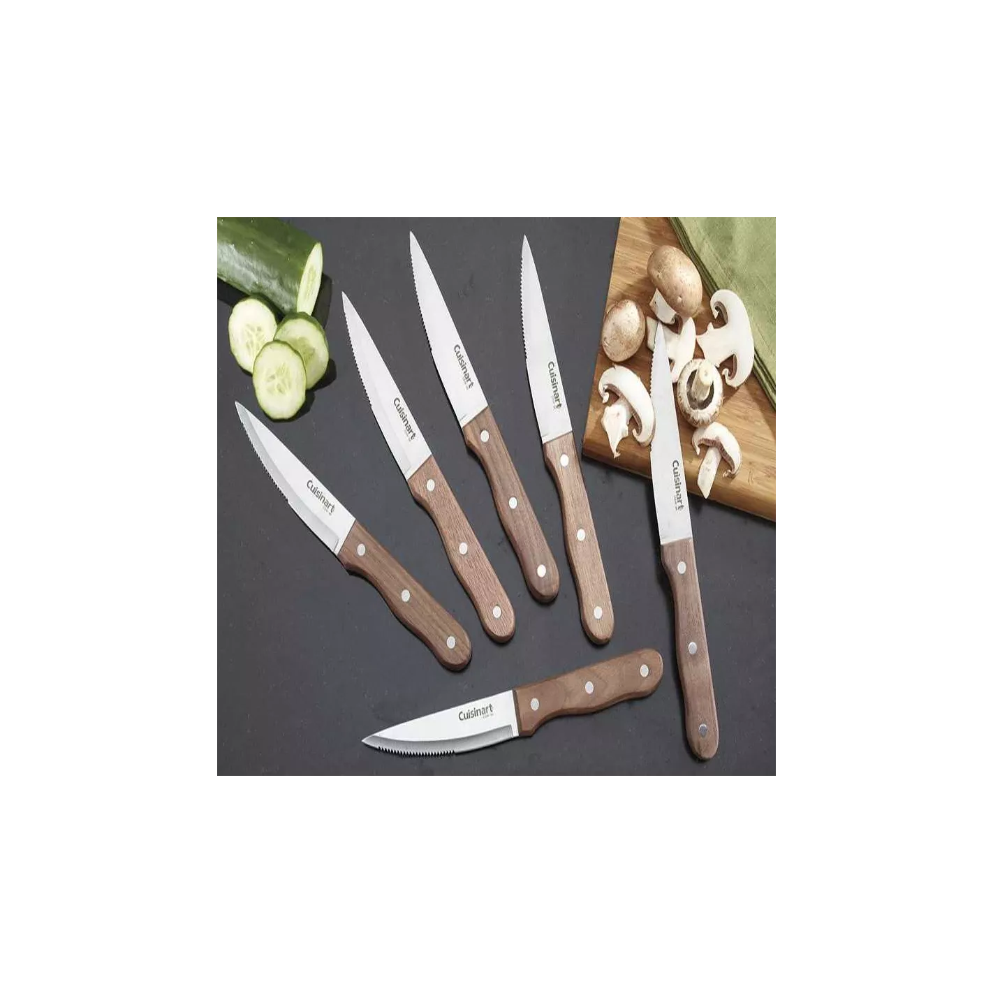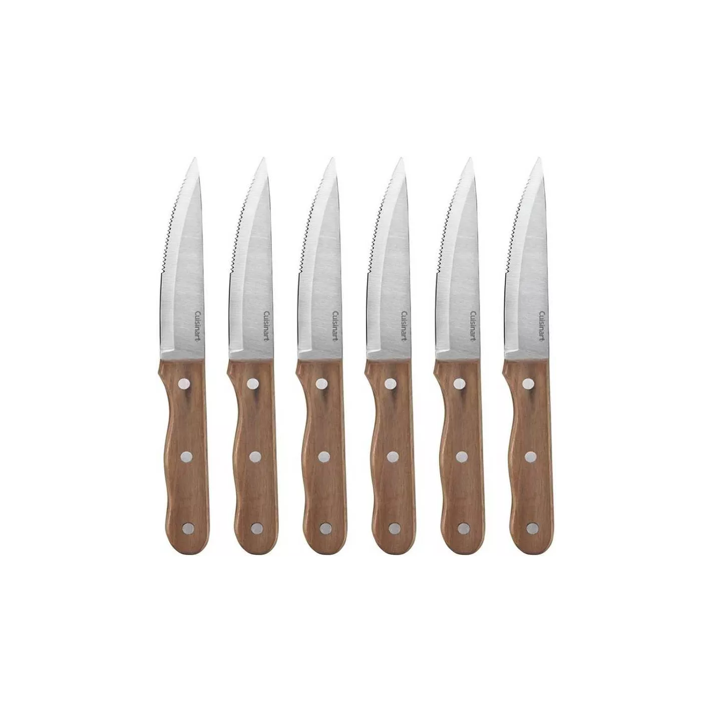 Con hojas cónicas de precisión, el juego de cuchillos para carne de nogal con remaches triples de 6 piezas combina ingeniería moderna con un diseño clásico. Con bordes excepcionalmente afilados hechos de acero inoxidable con alto contenido de carbono, estas cuchillas Cuisinart se recomiendan para cortar de forma más segura y precisa.