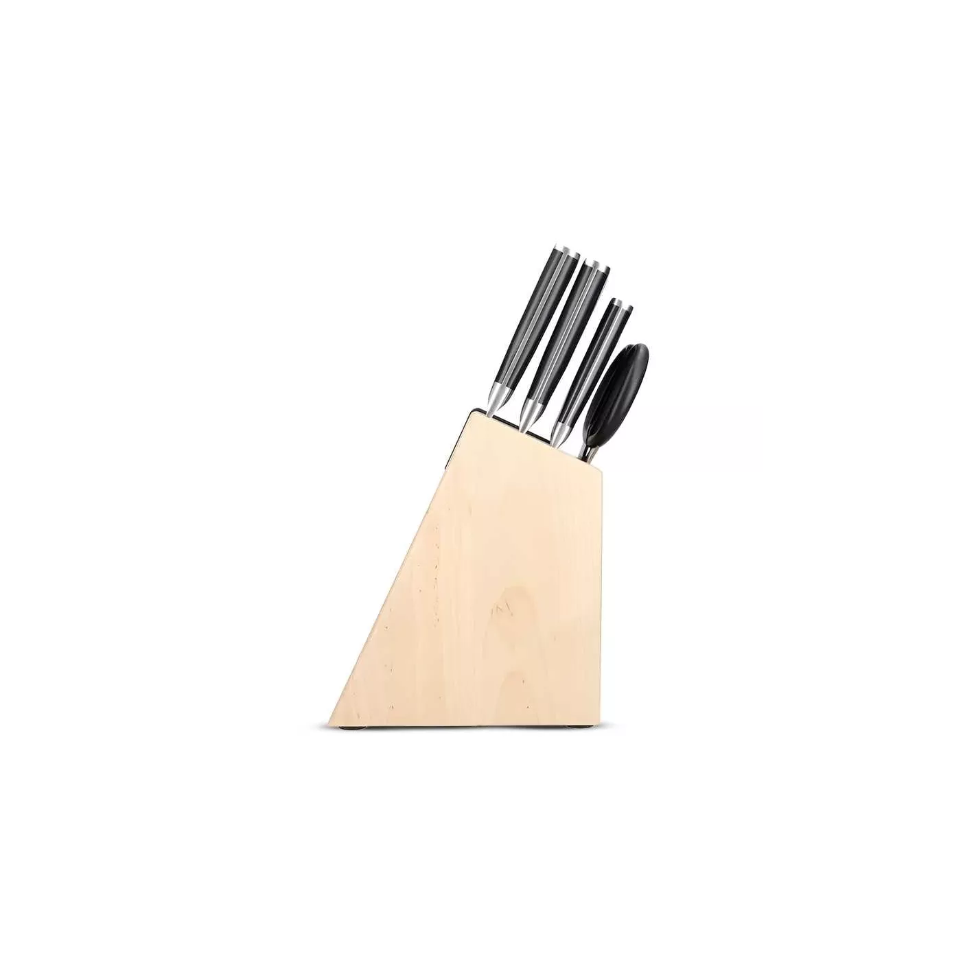 Cada hoja forjada está elaborada por expertos con acero japonés con alto contenido de carbono para un corte profesional y de calidad en todo momento. Fabricados para una excelente estabilidad y control, los mangos están bien equilibrados y cuentan con una construcción de triple remache para un agarre seguro y cómodo. El bloque de almacenamiento contemporáneo de madera de abedul cuenta con un afilador incorporado para afilar sin esfuerzo y complementa cualquier cocina.