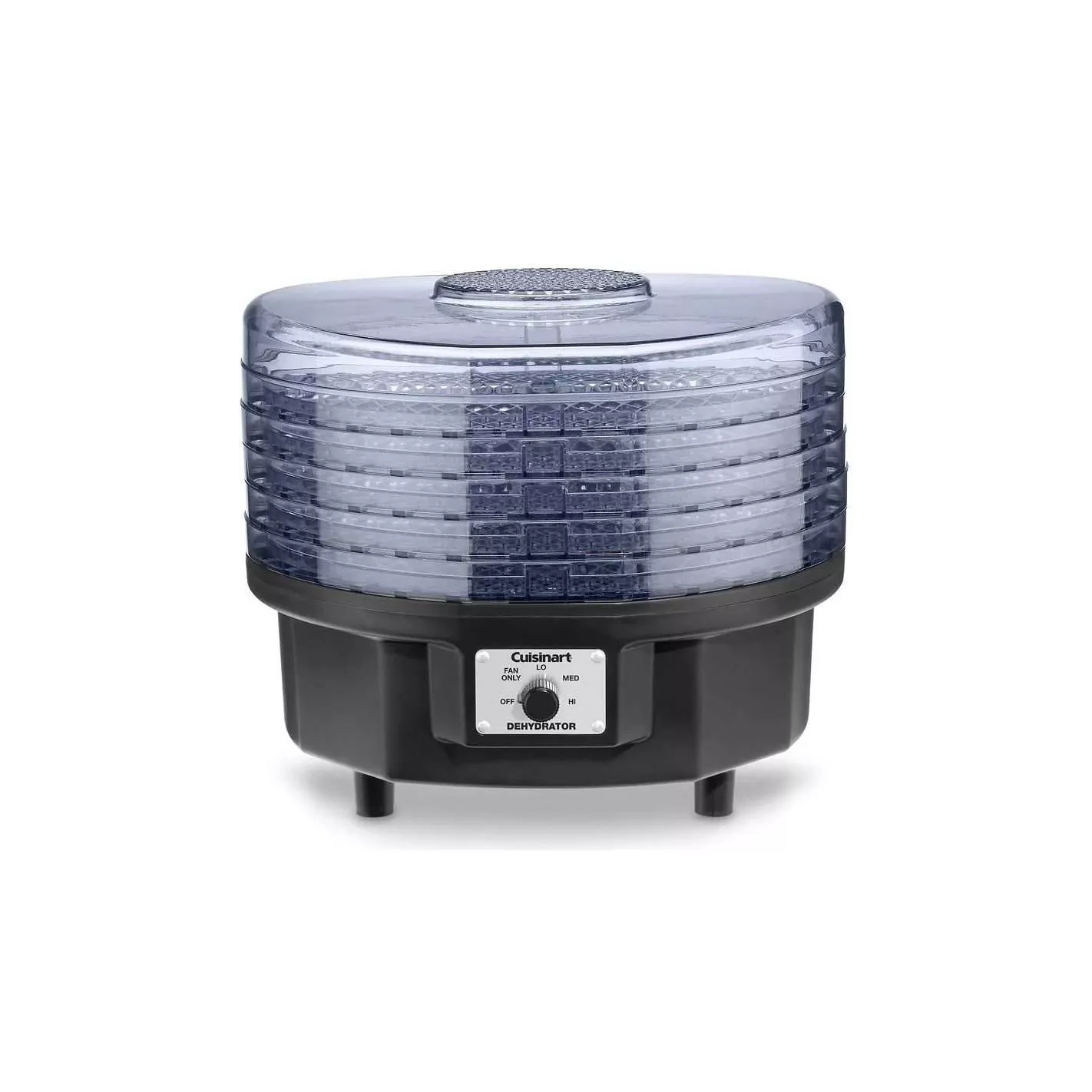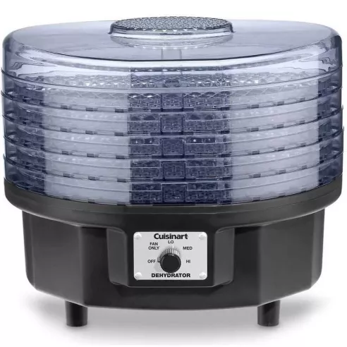El deshidratador de alimentos Cuisinart hace que sea fácil crear bocadillos nutritivos, deliciosos y secos como carne crujiente, rollos de frutas y papas fritas vegetales. Conserva los alimentos de forma natural, sin aditivos ni conservantes. Un potente ventilador motorizado de 620 vatios tiene una ventilación superior que permite que el calor circule uniformemente y eficientemente, para un secado más rápido y excelentes resultados. Un termostato ajustable permite diferentes temperaturas, dependiendo del tipo de alimento que se esté secando.