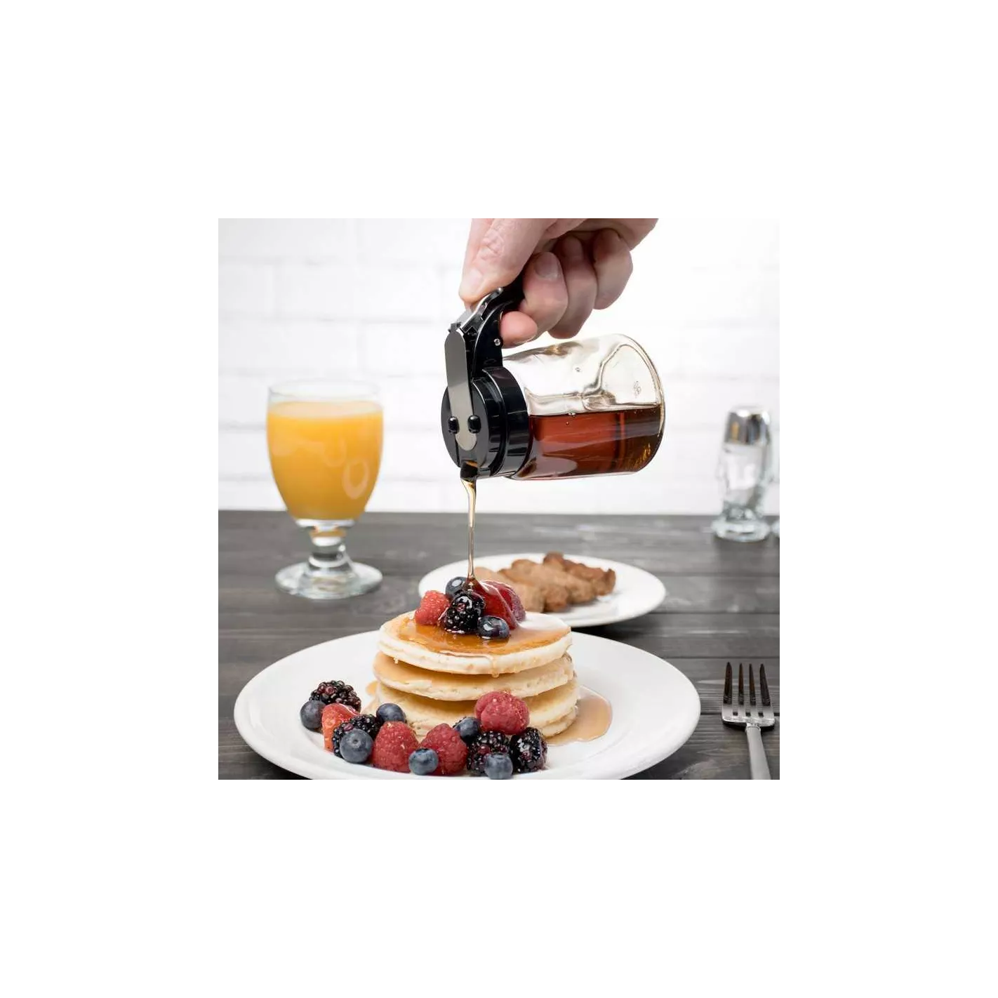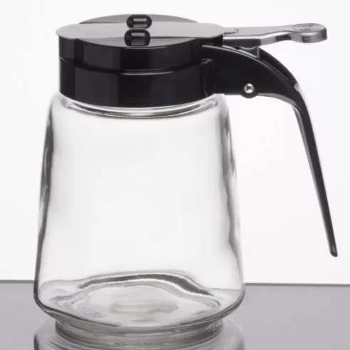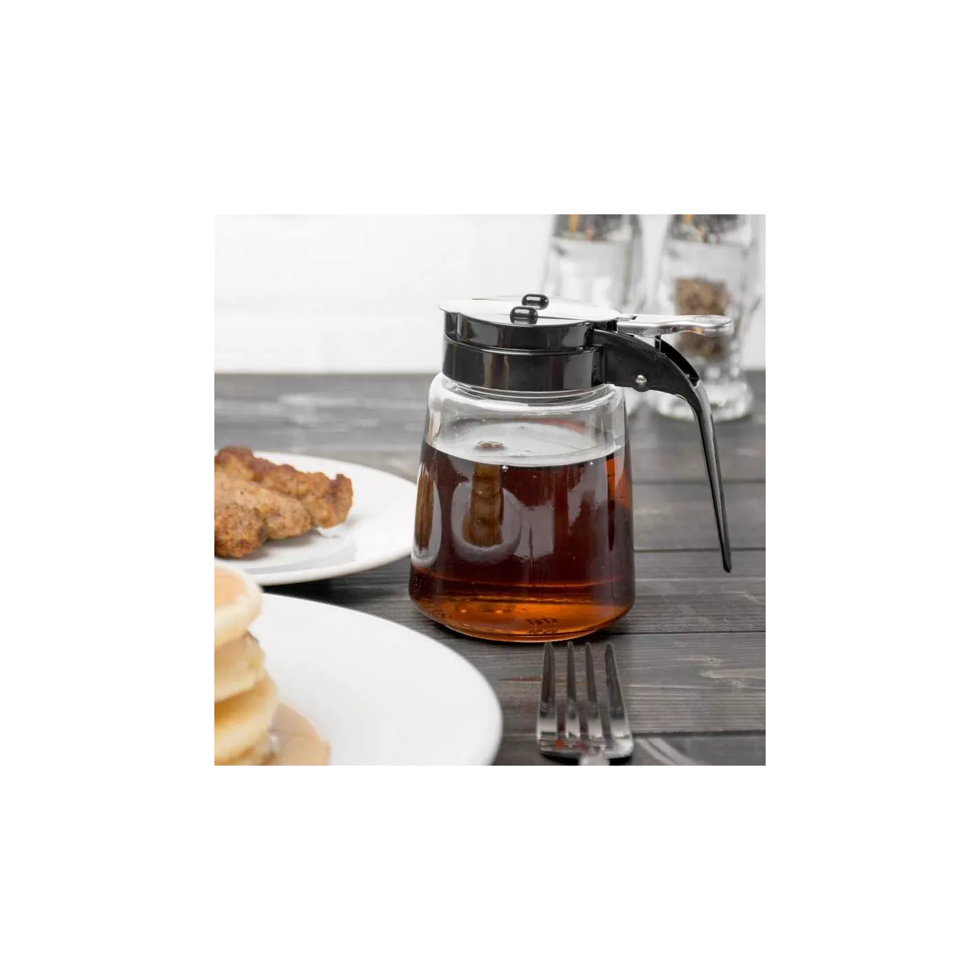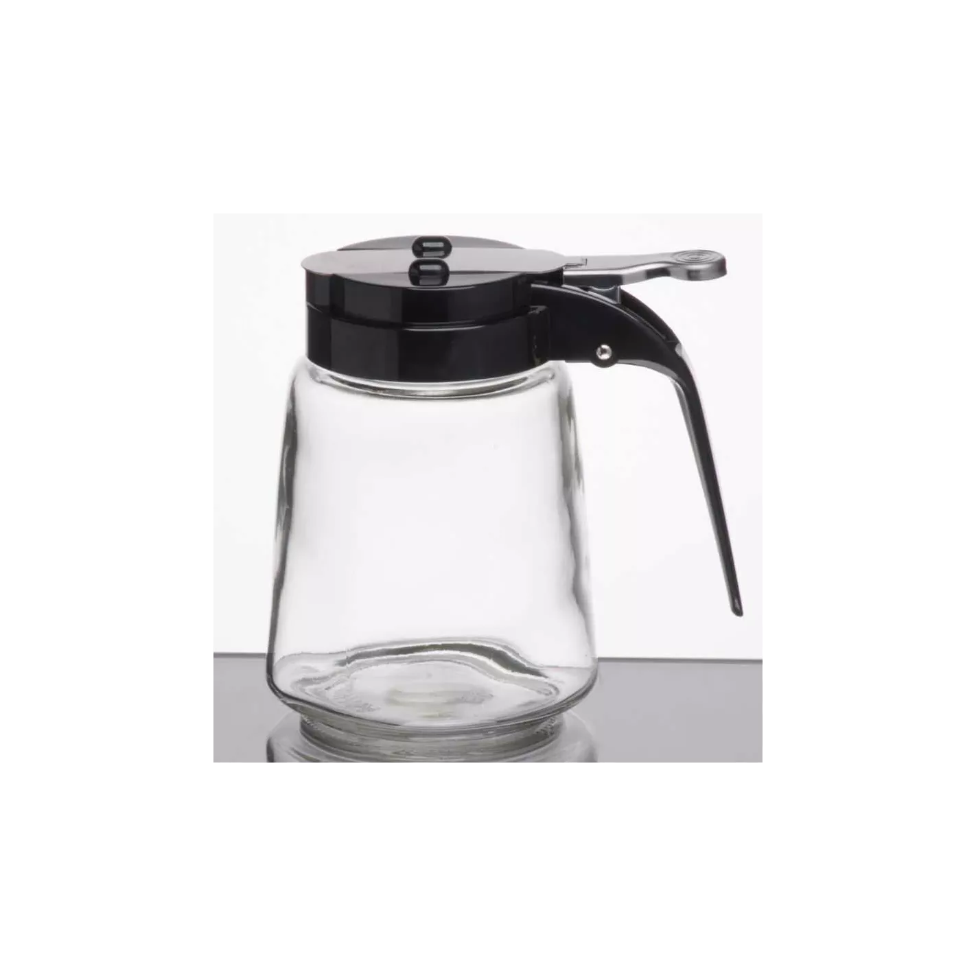 Sirva a sus clientes deliciosos jarabes, aderezos y miel con este dispensador de jarabe de vidrio, perfecto para comensales y restaurantes, cuenta con una tapa de ABS negra de fácil vertido para diferenciar el contenido y un asa grande para agarrarlo fácilmente. Con su diseño clásico, este dispensador combina moda y funcionalidad, ¡lo que lo convierte en una excelente adición a cualquier tablero de mesa!