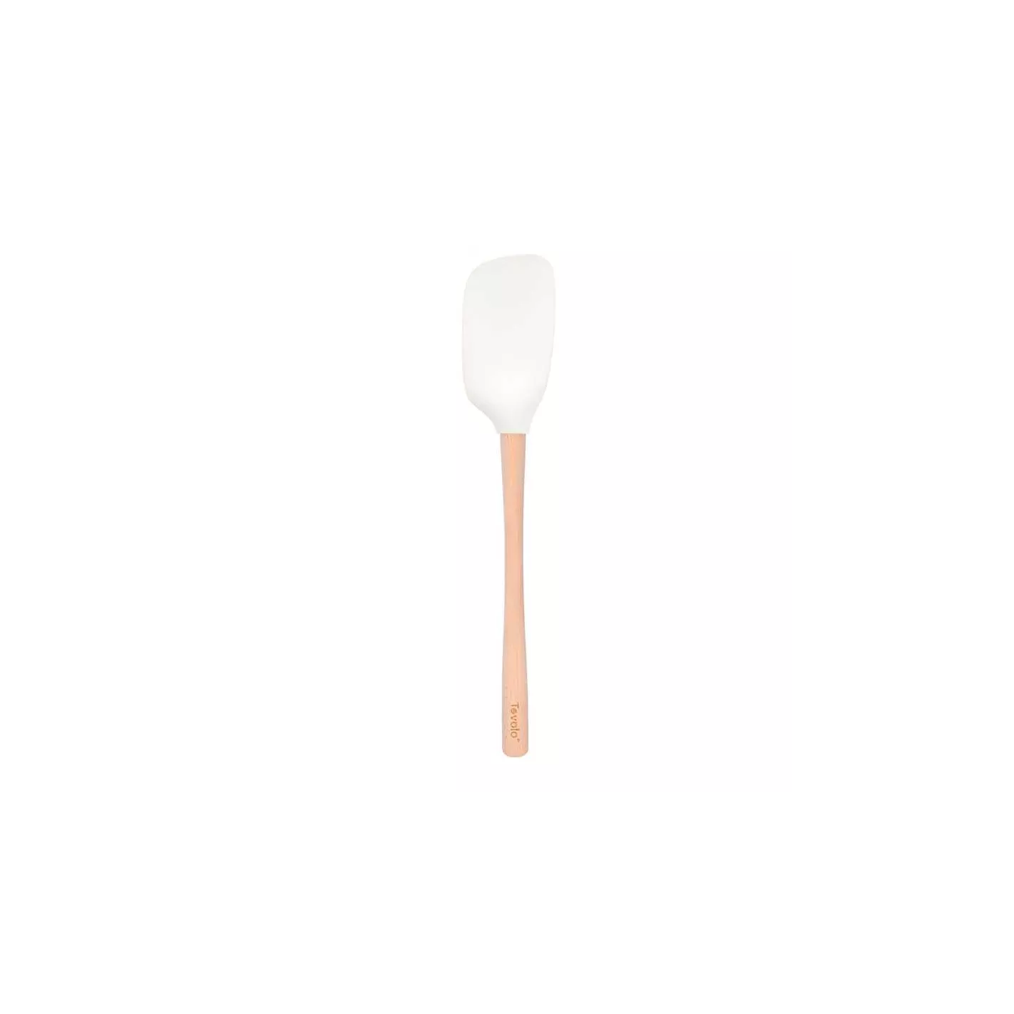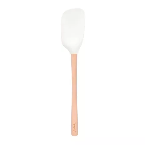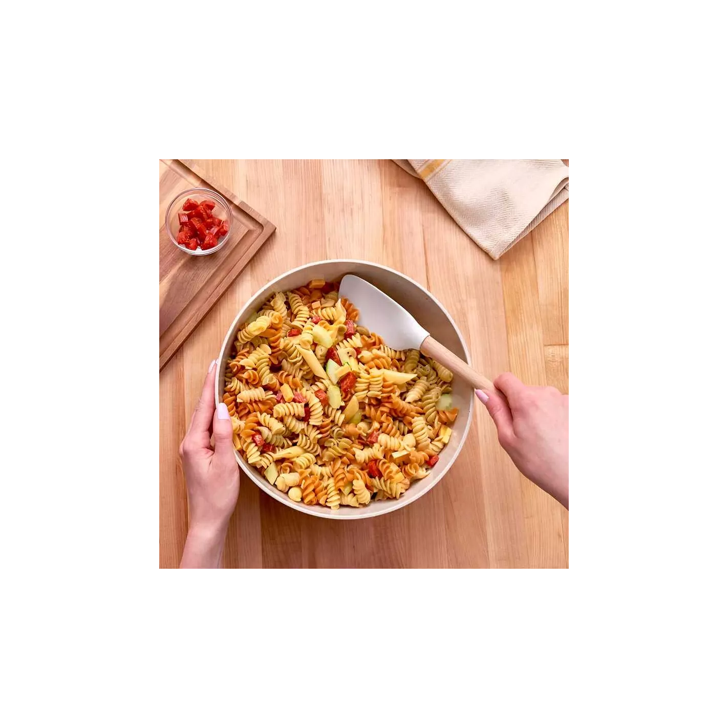 El cabezal descentrado con un tazón poco profundo es perfecto para todas sus necesidades de palado, y el revestimiento de silicona raspa los tazones y los utensilios para hornear sin rayar los frágiles revestimientos antiadherentes. El cabezal descentrado con tazón poco profundo es perfecto para todas sus necesidades de palado. El mango de madera agrega un aire de tradicionalismo a la moderna espátula de silicona. El mango ergonómico está diseñado para adaptarse cómodamente a la mano mientras mezcla, dobla, raspa, unta, da vuelta y sirve.