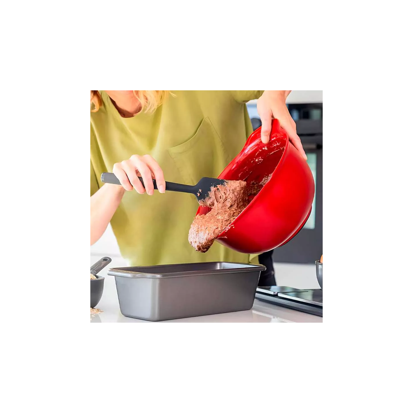Es ideal para mezclar ingredientes o raspar el último resto de masa de su tazón. Esta espátula resistente y duradera es segura para todos los utensilios de cocina, incluidos los antiadherentes, y es resistente al calor hasta 260 °C/500 °F.