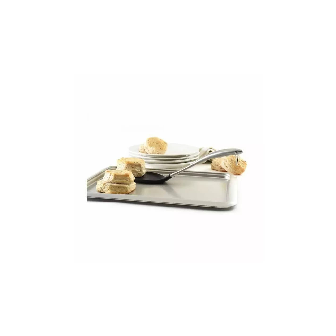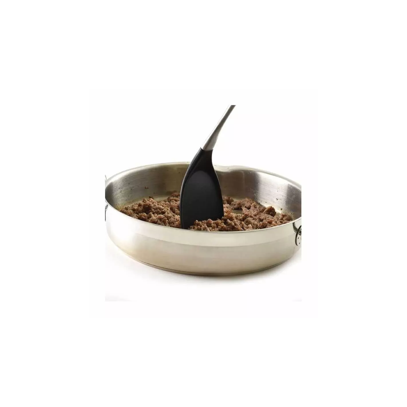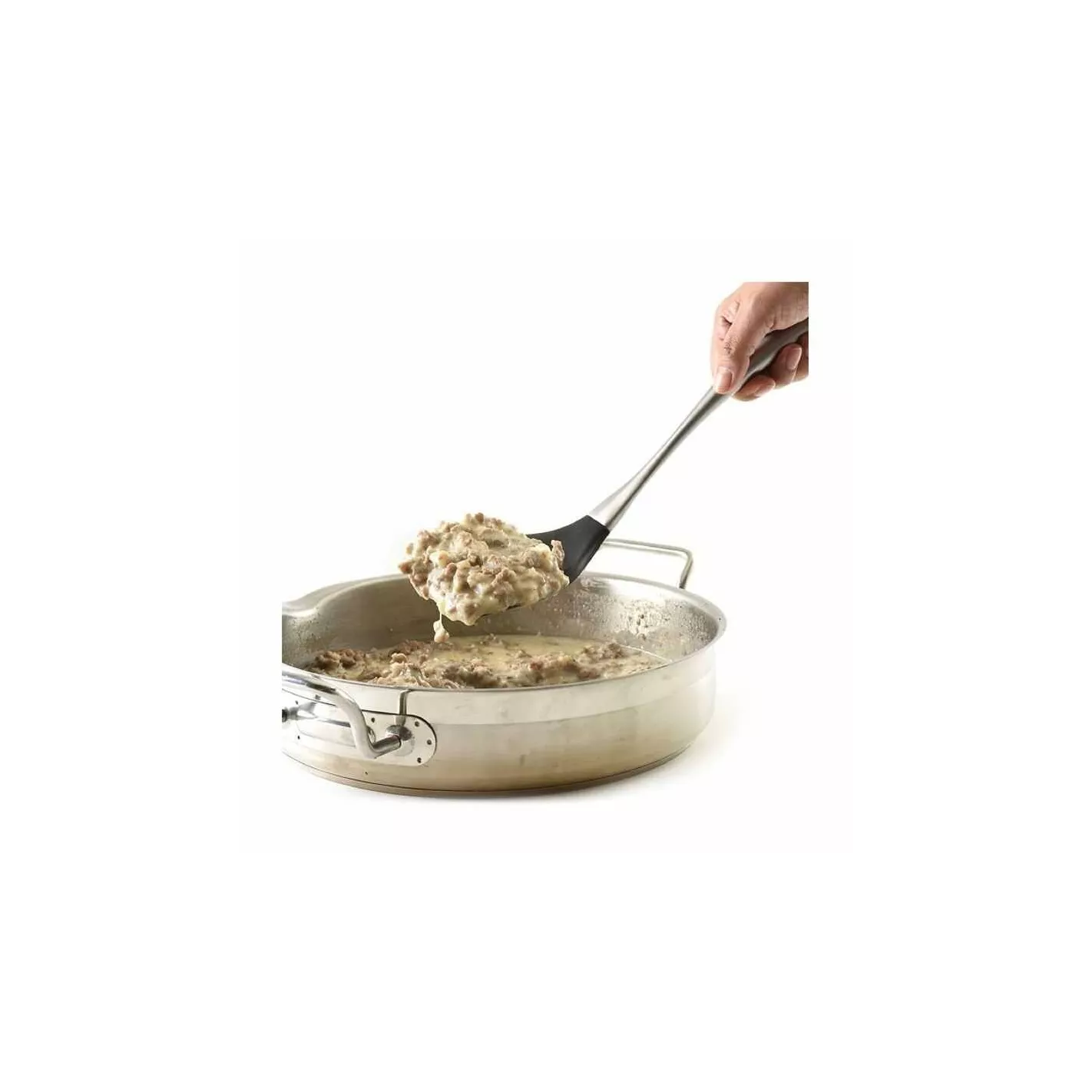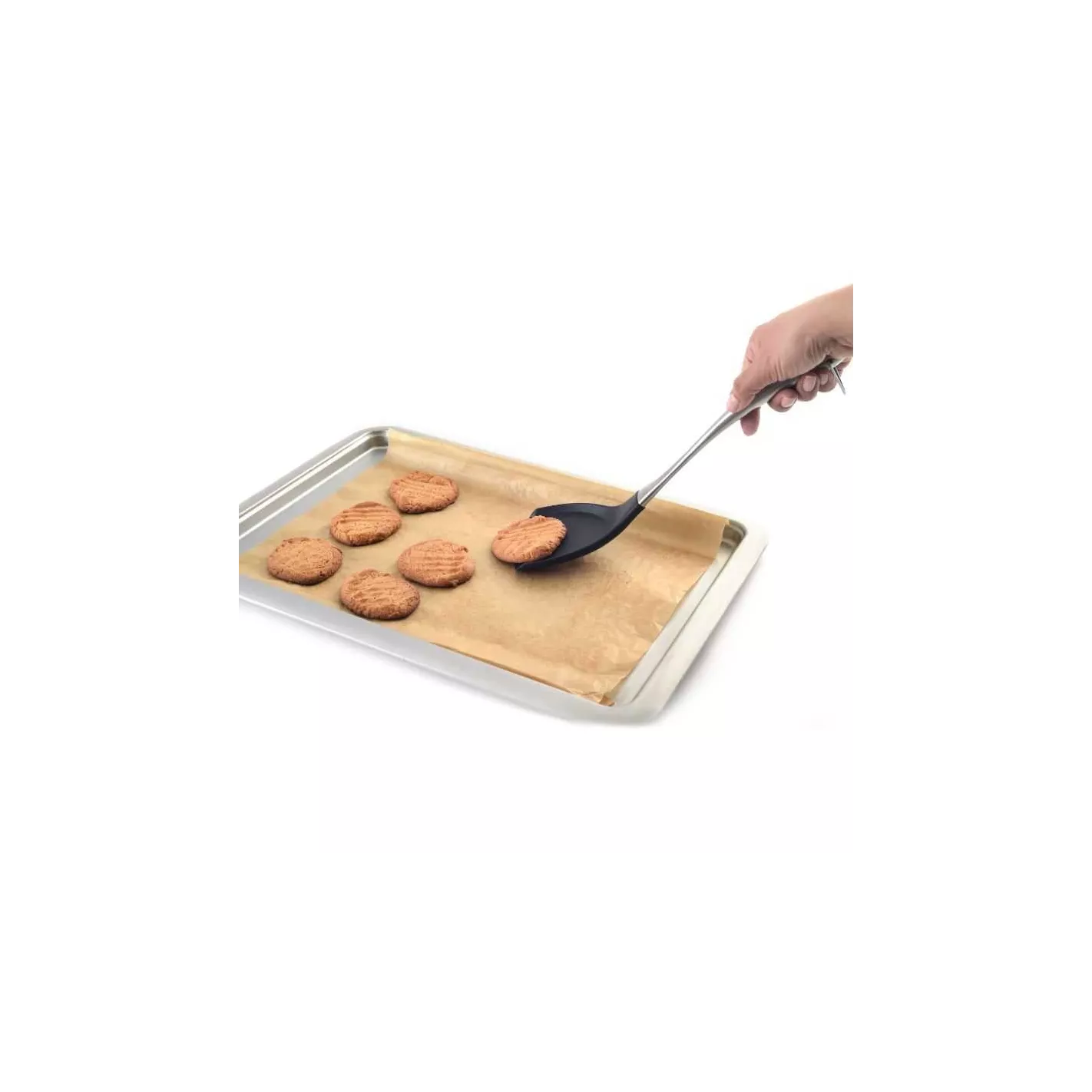 Compatible con todos los utensilios de cocina antiadherentes. El cabezal de silicona está aprobado por la FDA y es de grado alimenticio europeo (LFGB), con mango de acero inoxidable cepillado. Resistente al calor a 482°F / 250°C.