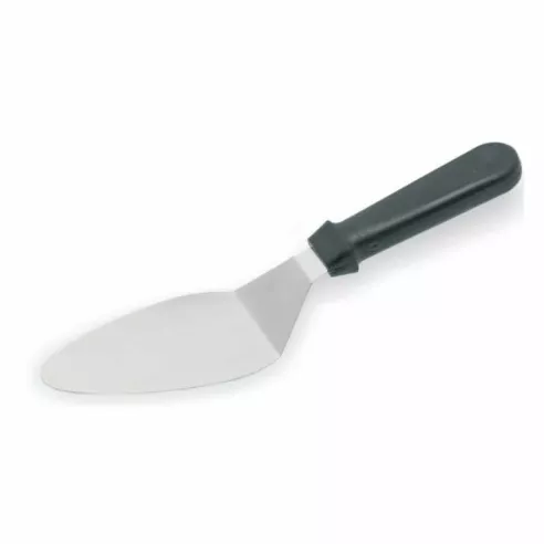 La espátula está fabricada en acero inoxidable y su mango en plástico de excelentes medidas higiénicas, tiene una medida de 30 centímetros. Apta para poder recolectar pizza directamente del molde, gracias a su forma triangular le permitirá retirar la pieza de pizza sin que se dañen sus lados.
