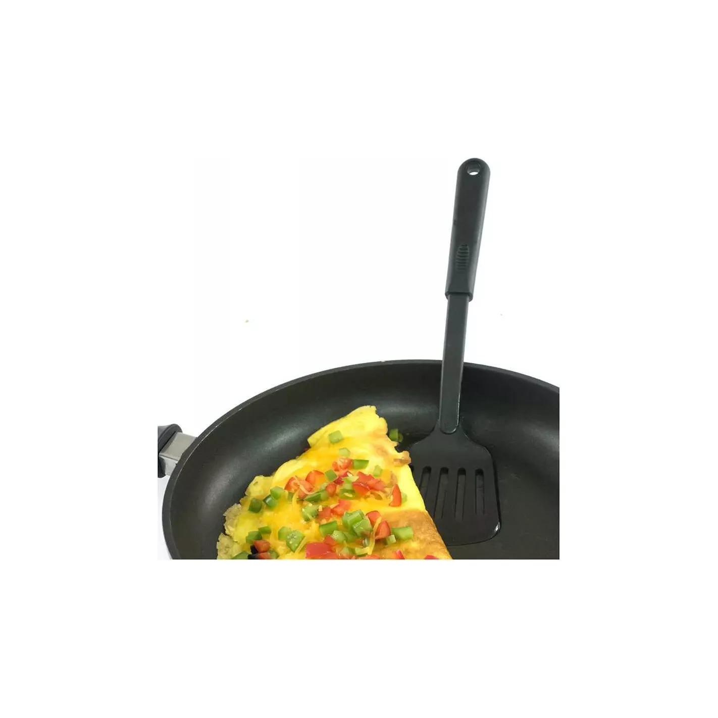 Lo suficientemente suave como para doblarse para raspar el fondo de las sartenes, pero lo suficientemente firme como para levantar pescado y huevos. Nylon de alta resistencia al calor hasta 410° F / 210° C. Las manijas antideslizantes con agarre para el pulgar brindan un control superior. Seguro para utensilios de cocina con revestimiento de esmalte y vidrio antiadherente.