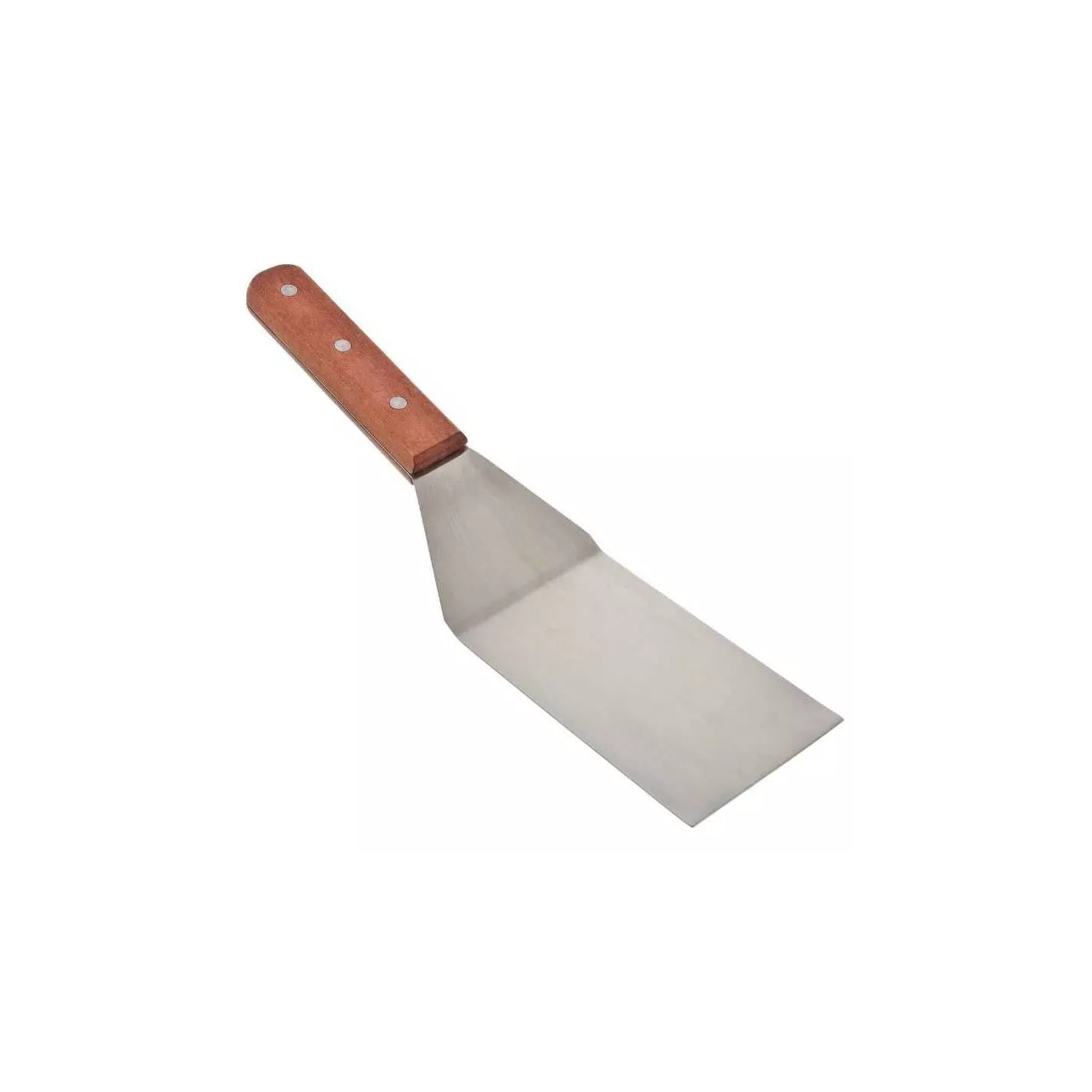 Voltee y gire la comida con esta espátula sólida para plancha o parrilla. Construido con un acero inoxidable duradero, presenta un acabado de alto pulido para que se vea genial y duradero. Este utensilio cuenta con un mango solido remachado resistente. Use esta espátula para voltear la carne o el pollo para promover una cocción pareja.