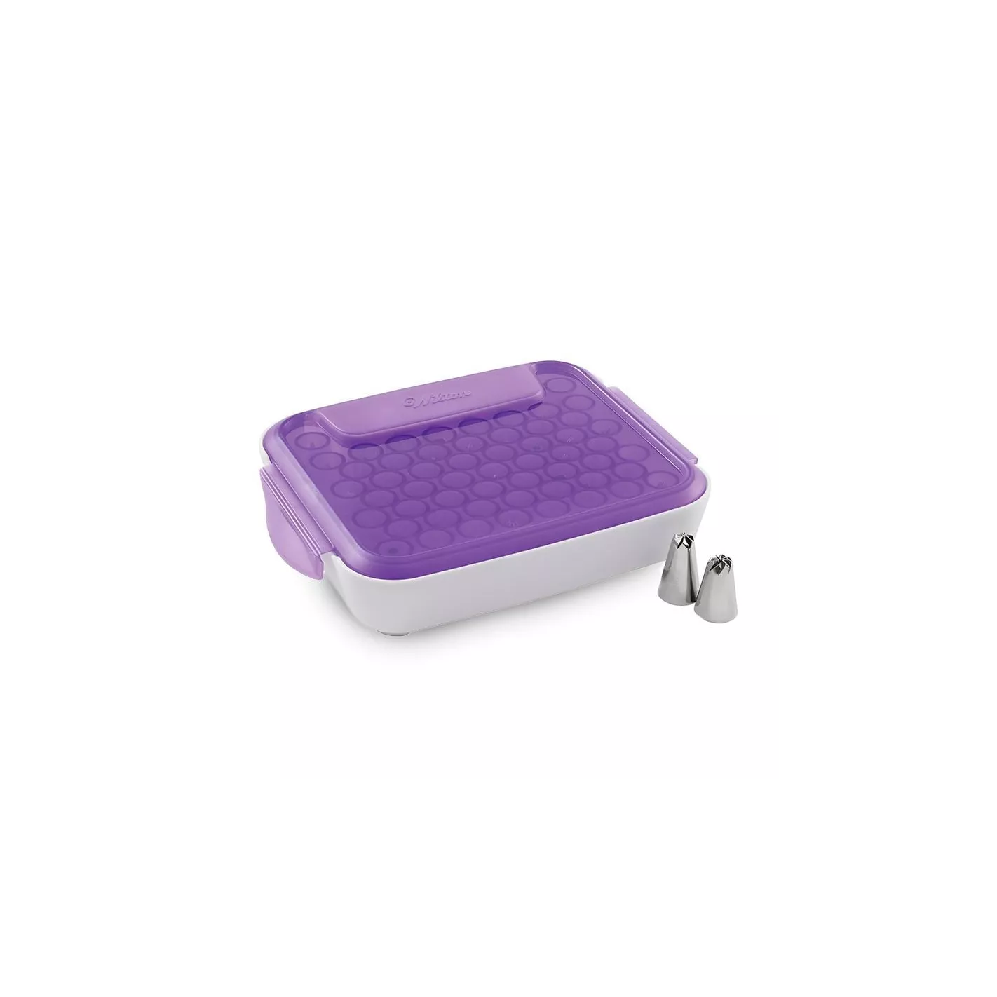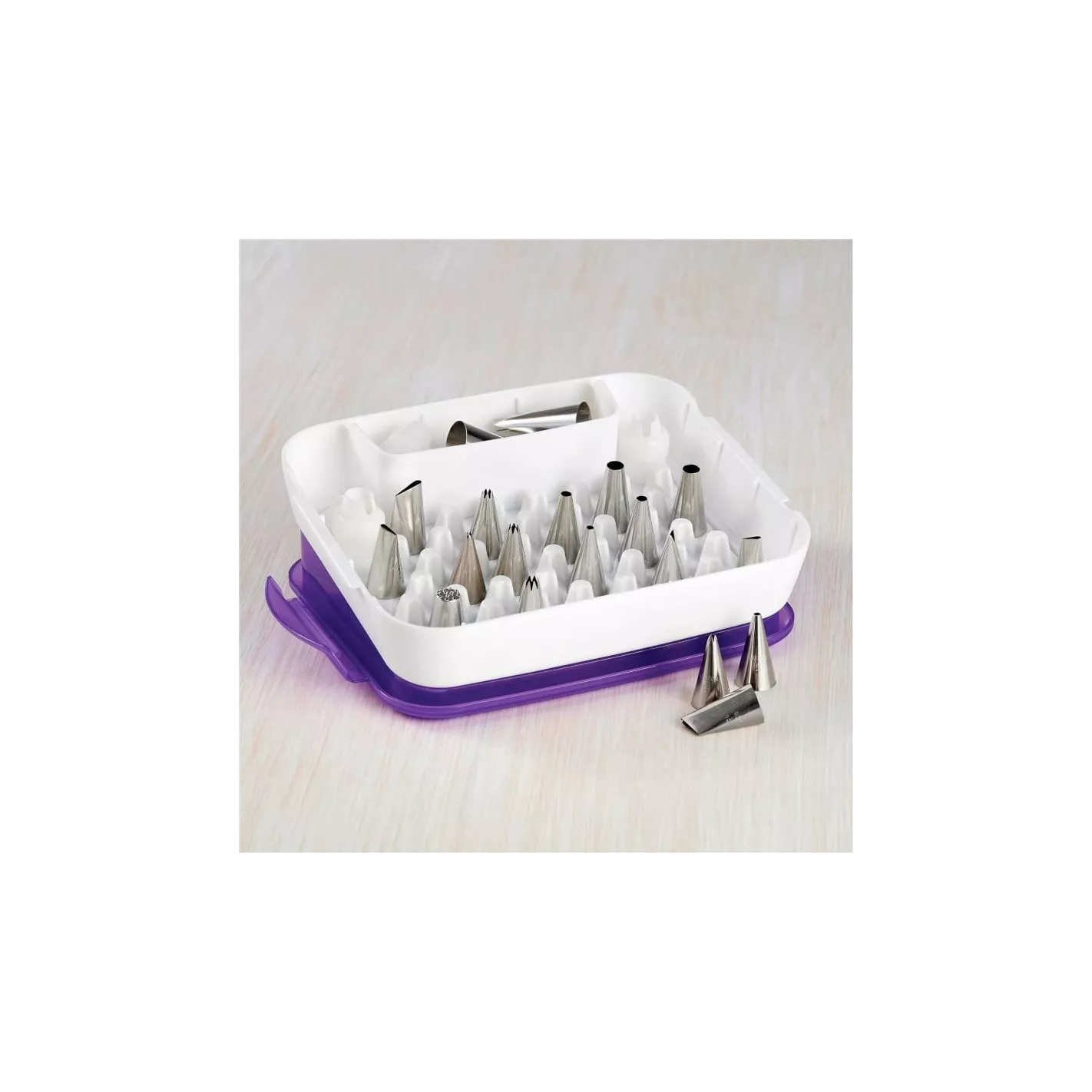 Nunca más vuelvas a buscar sin parar tus boquillas favoritas con este estuche organizador fácil de usar. Guarda hasta 55 boquillas de decoración de tamaño estándar (boquillas se venden por separado) y puede apilarlas si necesita más espacio. Tiene un compartimiento separado para acopladores y clavos; la tapa transparente de color púrpura se ajusta debajo de la bandeja de almacenamiento para maximizar el espacio de trabajo y se cierra para mantener las boquillas en su lugar cuando no se usa.