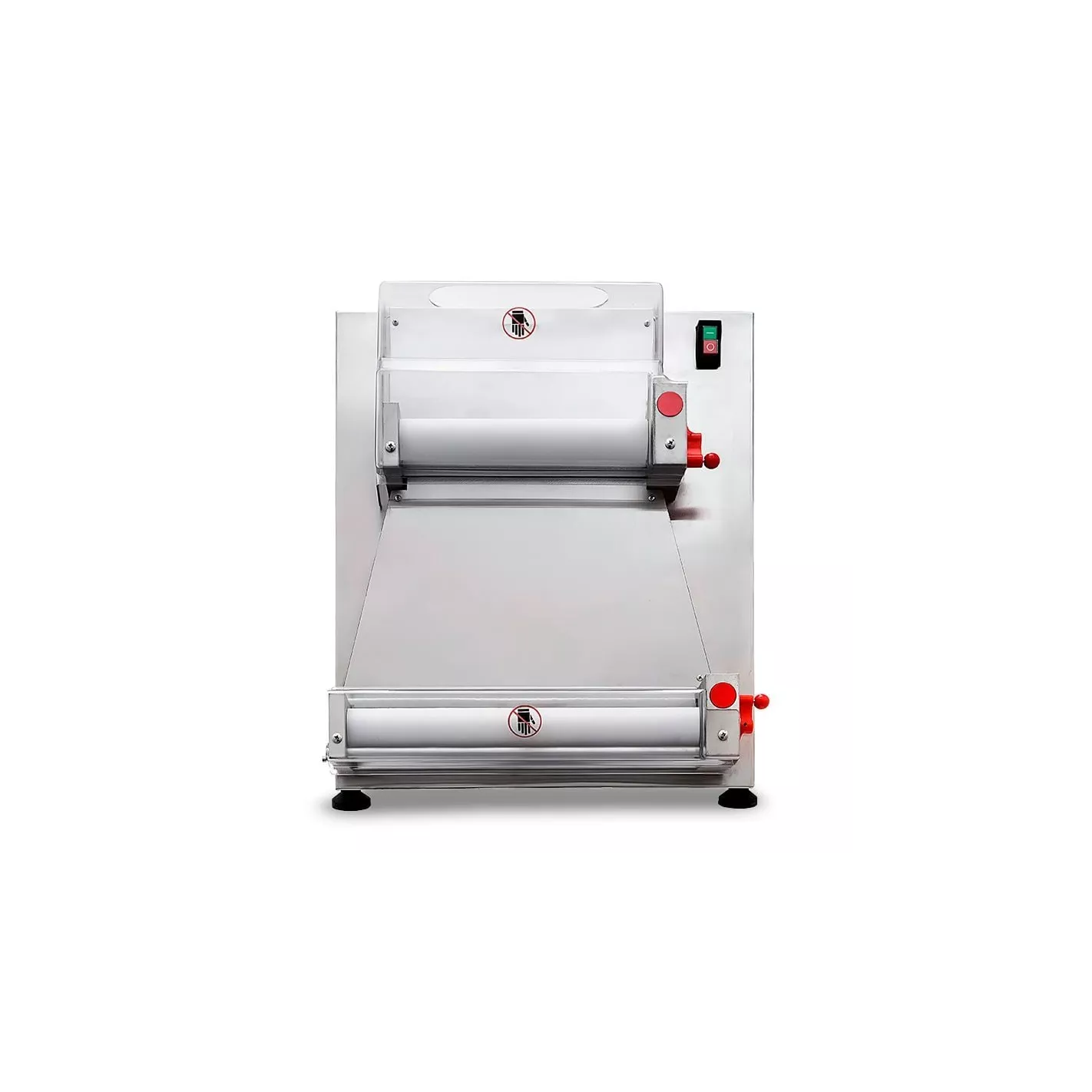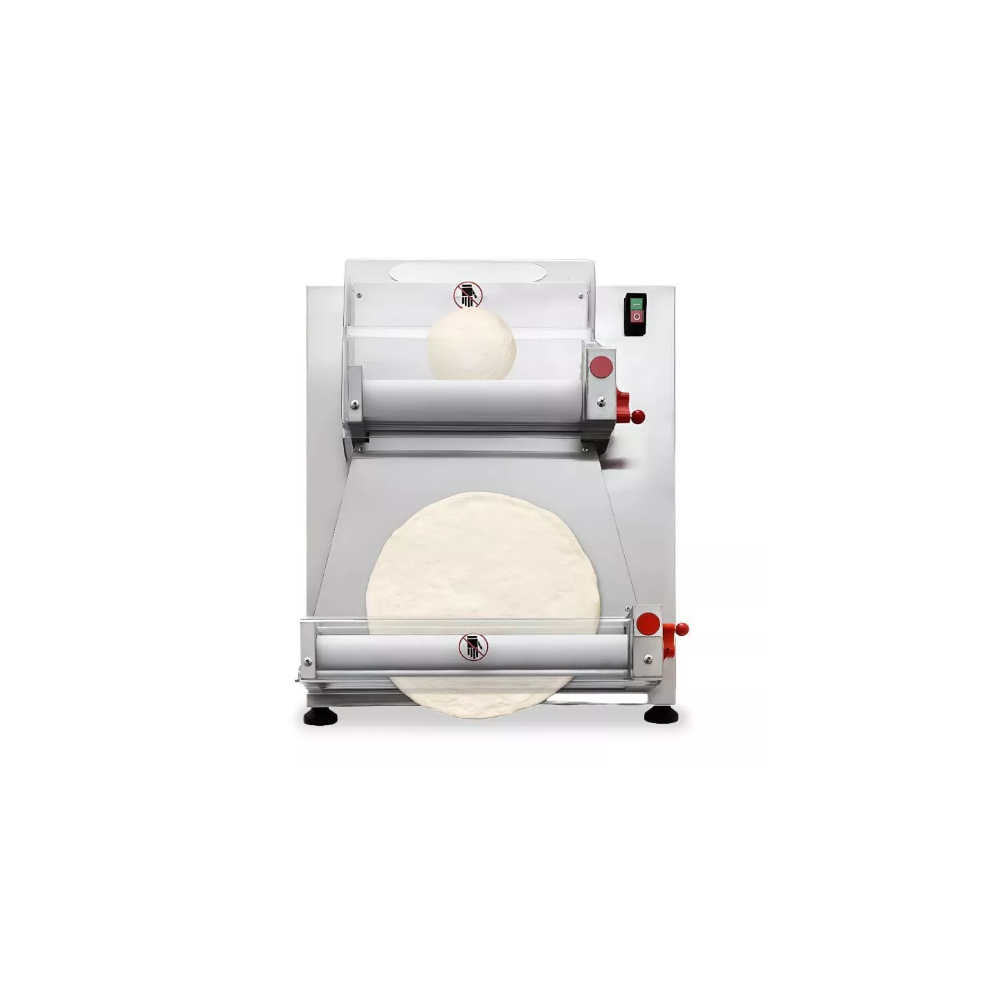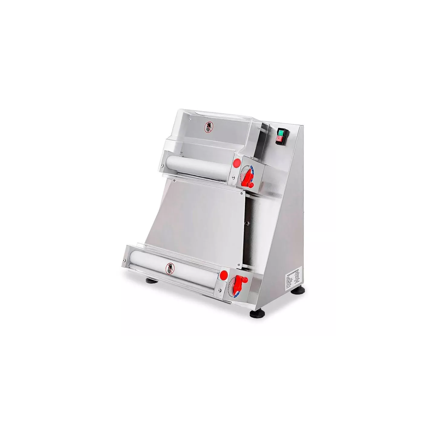 Dos rodillos de resina de grado alimenticio ampliamente utilizados pueden presionar rápida y fácilmente la masa de pizza, el grosor de la masa se puede ajustar. Dos cubiertas de seguridad de rodillo transparentes están hechas de plástico Polipropileno, duraderas, higiénicas y pueden evitar lesiones accidentales. Fácil de usar; simplemente ponga la masa en la entrada del rodillo superior, presione la masa en forma ovalada con el rodillo, gire la masa ovalada con la mano y colóquela en el rodillo inferior y presione el rodillo inferior para hacer una pizza redonda. El cuerpo principal de la máquina formadora está hecho de acero inoxidable de alta resistencia.