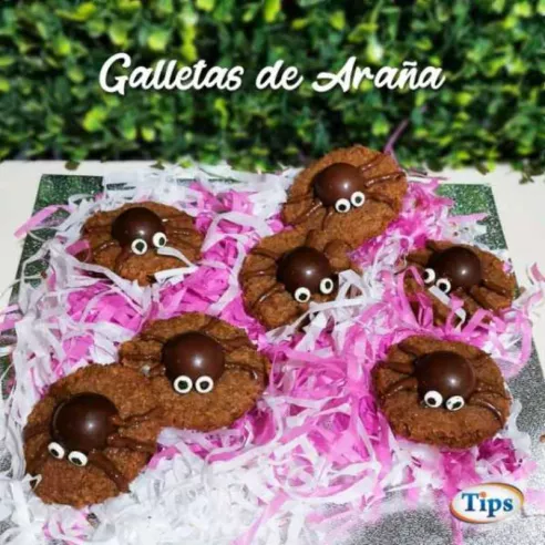 6-Coloque sobre la galleta la media esfera y con la choco cubierta las patas de la araña y coloque los ojos.