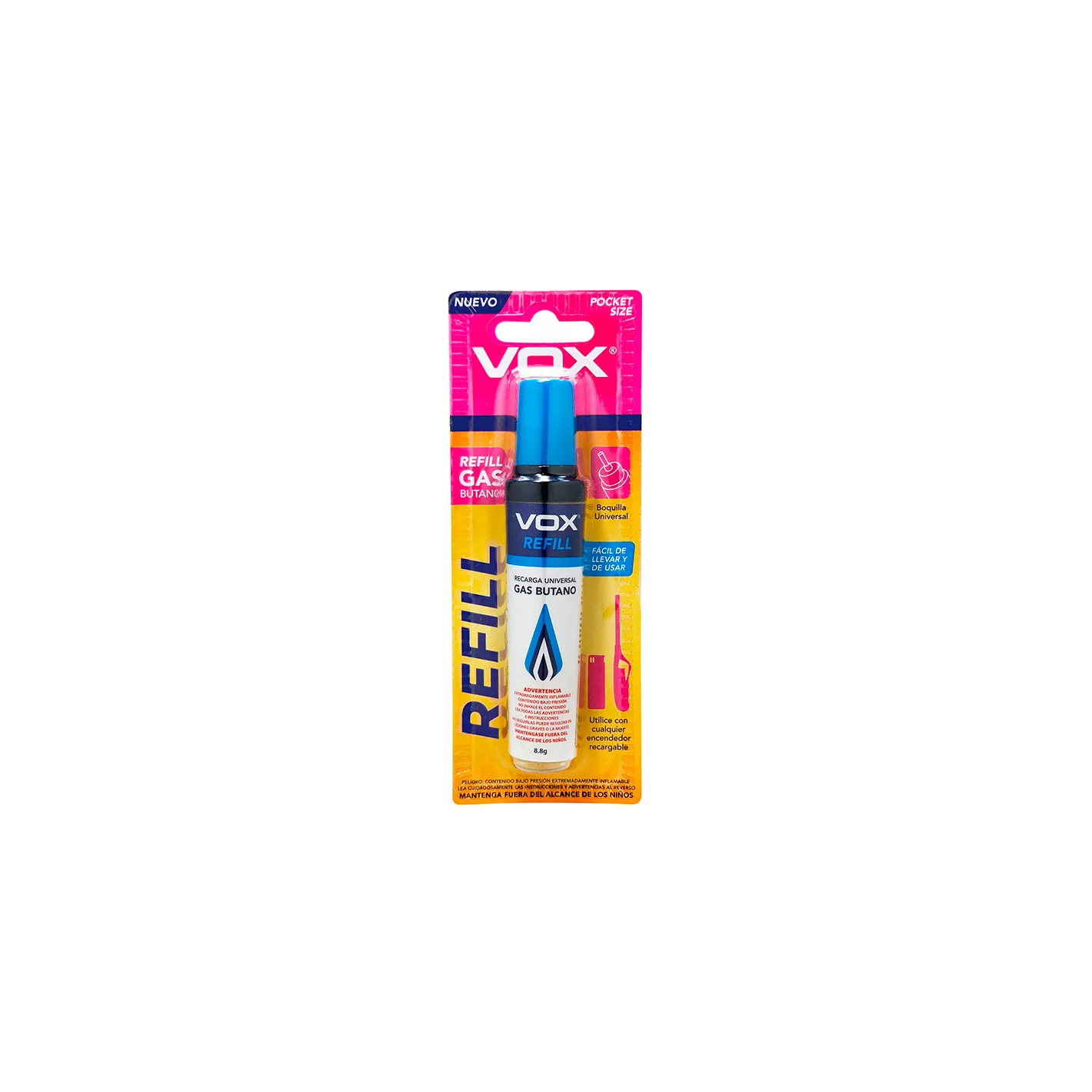 Producto diseñado para recargar dispositivos que funcionan con gas butano, como encendedores, sopletes y otros aparatos similares. Presione firmemente y mantenga durante unos segundos hasta que el dispositivo esté lleno. Retire el repuesto y espere unos minutos antes de usar el dispositivo para permitir que el gas se estabilice.