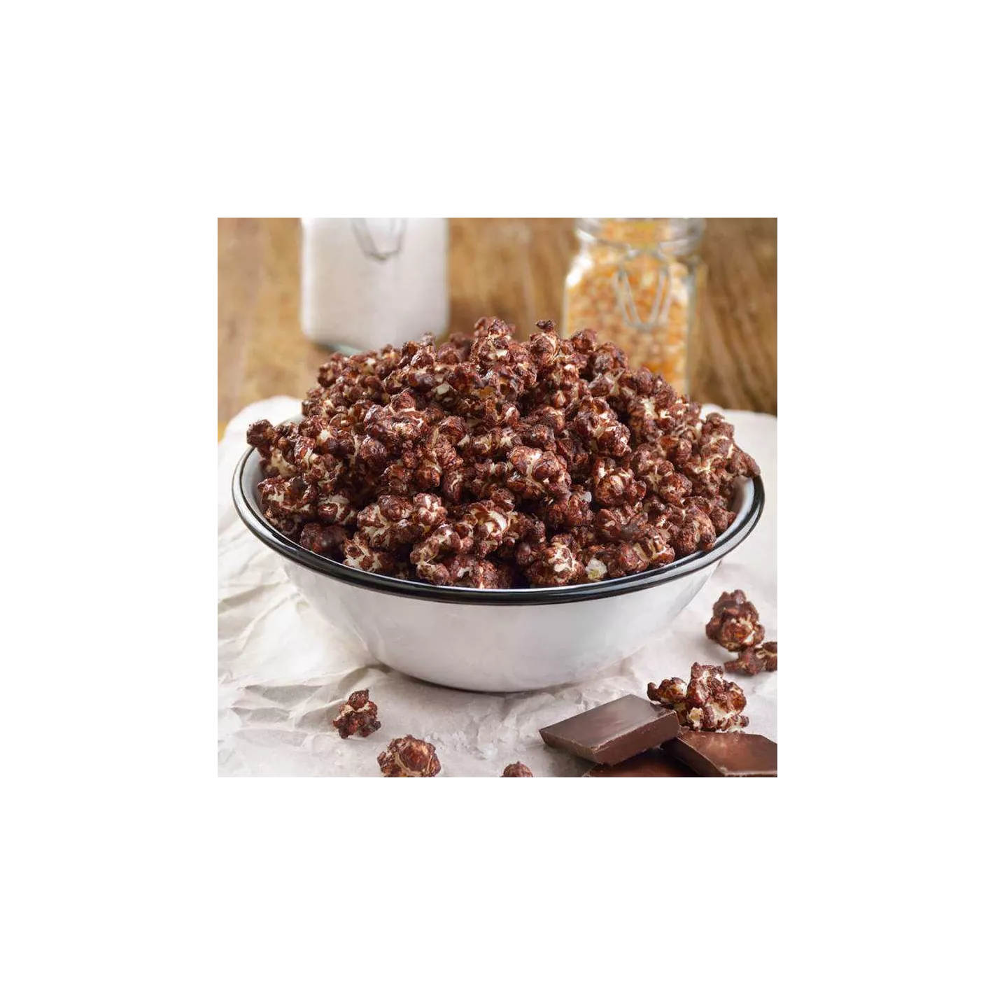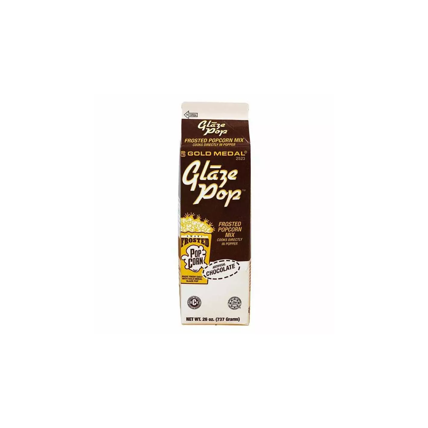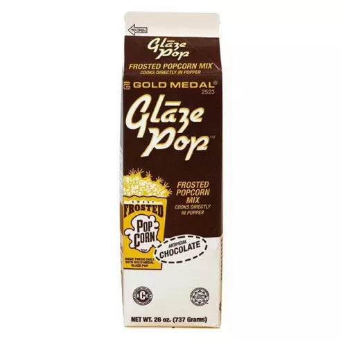 Chocolate Glaze Pop está especialmente diseñado como una capa de azúcar con sabor para palomitas de maíz que se aplica en el hervidor como un glaseado fundido cuando se hacen estallar las palomitas de maíz. Este producto es una mezcla de azúcares refinados con sabor y color artificiales.
