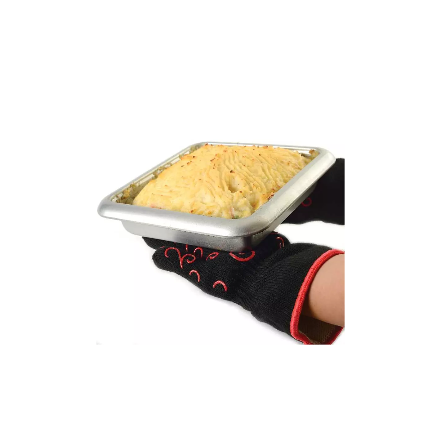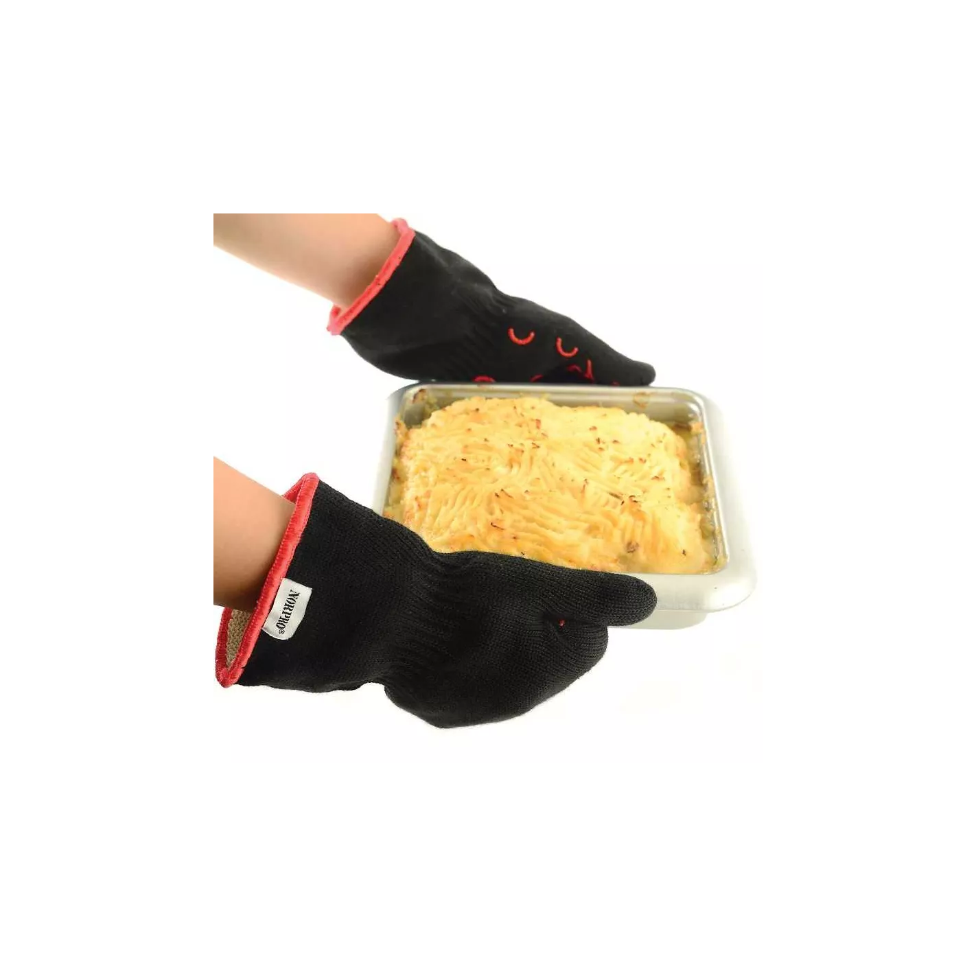 Caliente o no, cualquier sartén u olla es perfectamente segura para sostener con sus propias manos, siempre y cuando se haya puesto el par de guantes para horno de Norpro, por supuesto. Construidos con los mejores materiales resistentes al calor del mundo, los guantes fueron diseñados para una protección superior con el uso de fibra de aramida, que se usa a menudo en productos aeroespaciales y militares como el refuerzo de cascos marinos y chalecos antibalas. Los guantes negros y rojos también están adornados con silicona para agregar una calidad especial sólida y antideslizante para su beneficio diario. Ambos materiales son muy conocidos por su capacidad para resistir constantemente temperaturas más altas. Entonces, no importa lo que esté cocinando en la cocina, el calor es inevitable si se usa la estufa o el horno. Acepte lo que no puede cambiar y cambie lo que pueda con el par de guantes para horno Norpro para mantener sus manos sanas y salvas de los desafíos de cocinar u hornear.
