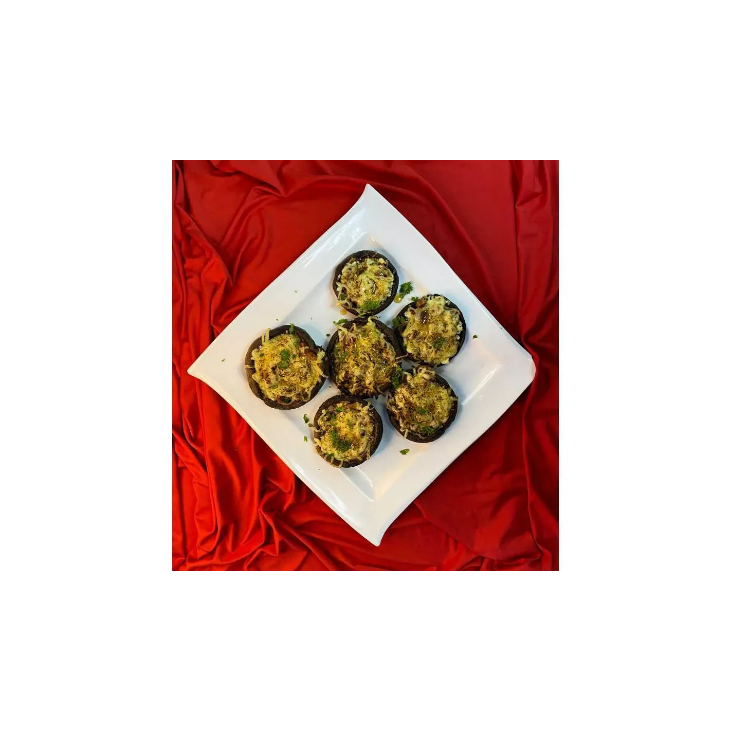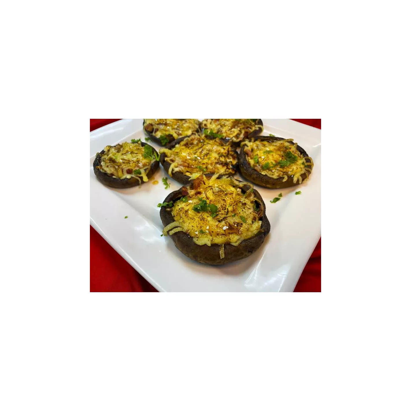 3.Se ponen los hongos a fuego bajo o indirecto en parrilla por 5 min, se rellenan de la tocineta, se les pone mozarella, se gratina a soplete, se sirven y se terminan bañando con miel de abeja.