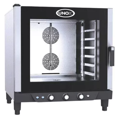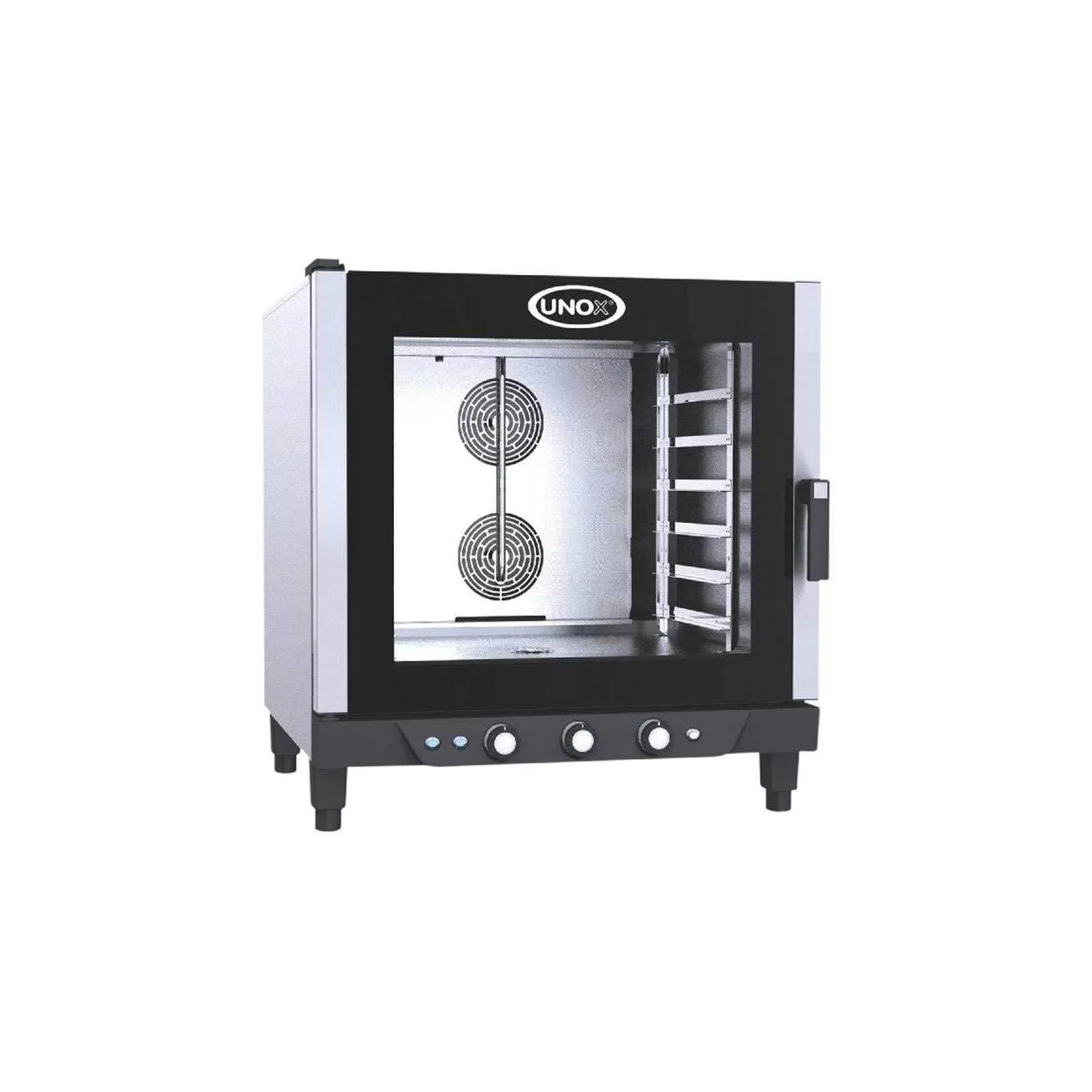 El horno a gas Unox de 5 bandejas pertenece a la gama Unox Bakerlux. Su funcionamiento es a través de aire forzado y control de la humedad en la cámara de cocción. El resultado, es un mejor sabor y aroma con una estructura interna idónea y una superficie externa crujiente y dorada. Se trata de un horno de convección, con capacidad para 5 bandejas de 600 x 400 milímitros (ancho x profundo), dos motores, una turbina con inversión de giro y sistema de humedad manual. Permite una cocción con temperatura regulable de 30º C a 260º C, puede aportar humedad a partir de los 48º C. El aire forzado y el calor se distribuye de manera perfecta y permite uniformidad en el horneado, proporcionando un acabado homogéneo y consistente. Hornea todo tipo de pan, bollería, pastelería y snack. Está preparado para satisfacer las exigencias de los profesionales y proporciona la calidad deseada de los productos.