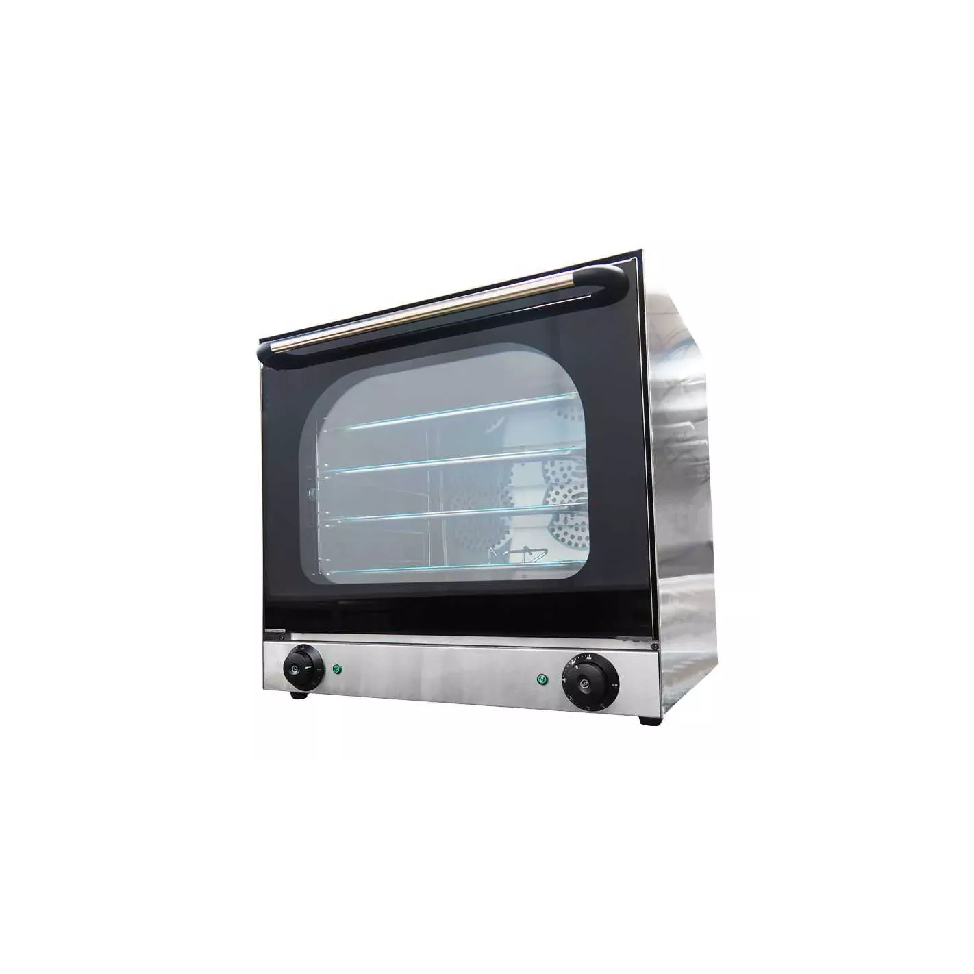 Horno de conveccion electrico, sin inyección de vapor con cámara de cocción de acero inoxidable. Control termostatico para la temperatura. Rango de temperatura de 50°C a 300°C con una potencia eléctrica de 2.67KW y voltaje de 220V/60Hz/1AC. El horno utiliza piezas eléctricas y operativas de clase mundial para proporcionar un calentamiento uniforme. Hay una luz en el horno para observar directamente la cocción en el horno a través del cristal. El dispositivo de protección contra sobrecalentamiento del horno puede cortar el suministro de energía cuando se sobrecalienta, lo cual es seguro y confiable.