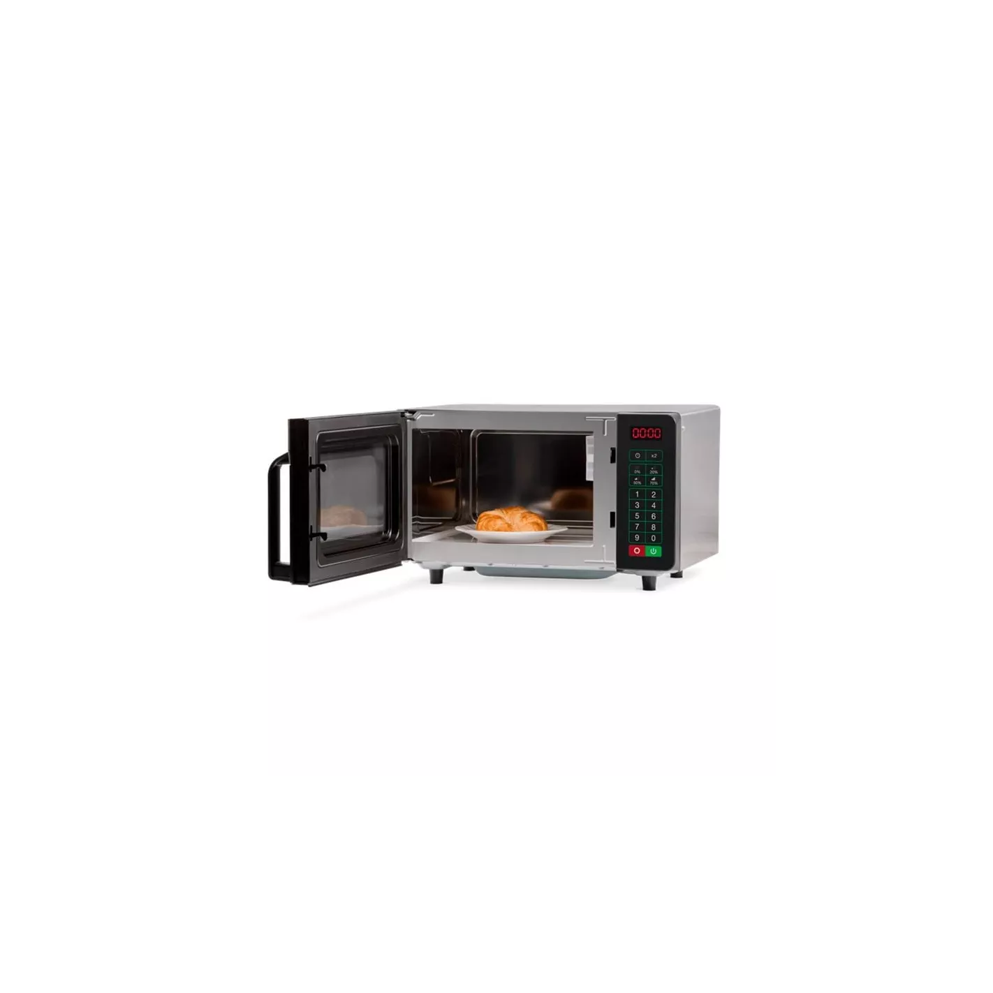 Este horno de microondas comercial cuenta con 1000 watts de potencia de cocción con 20 artículos de menú programables y 5 niveles de potencia. Perfecto para tiendas convenientes, estaciones de postre, cafeterías y salón de profesores. Recalentamiento y descongelación eficientes, reduce el desperdicio de alimentos. Construcción de acero inoxidable por dentro y por fuera.