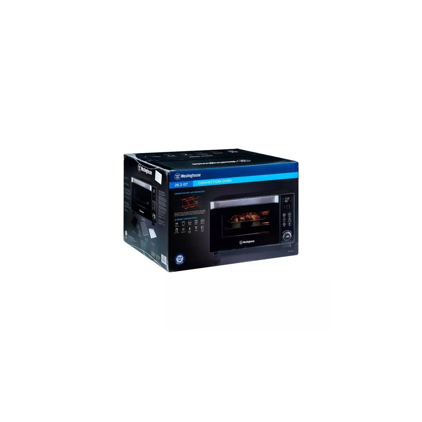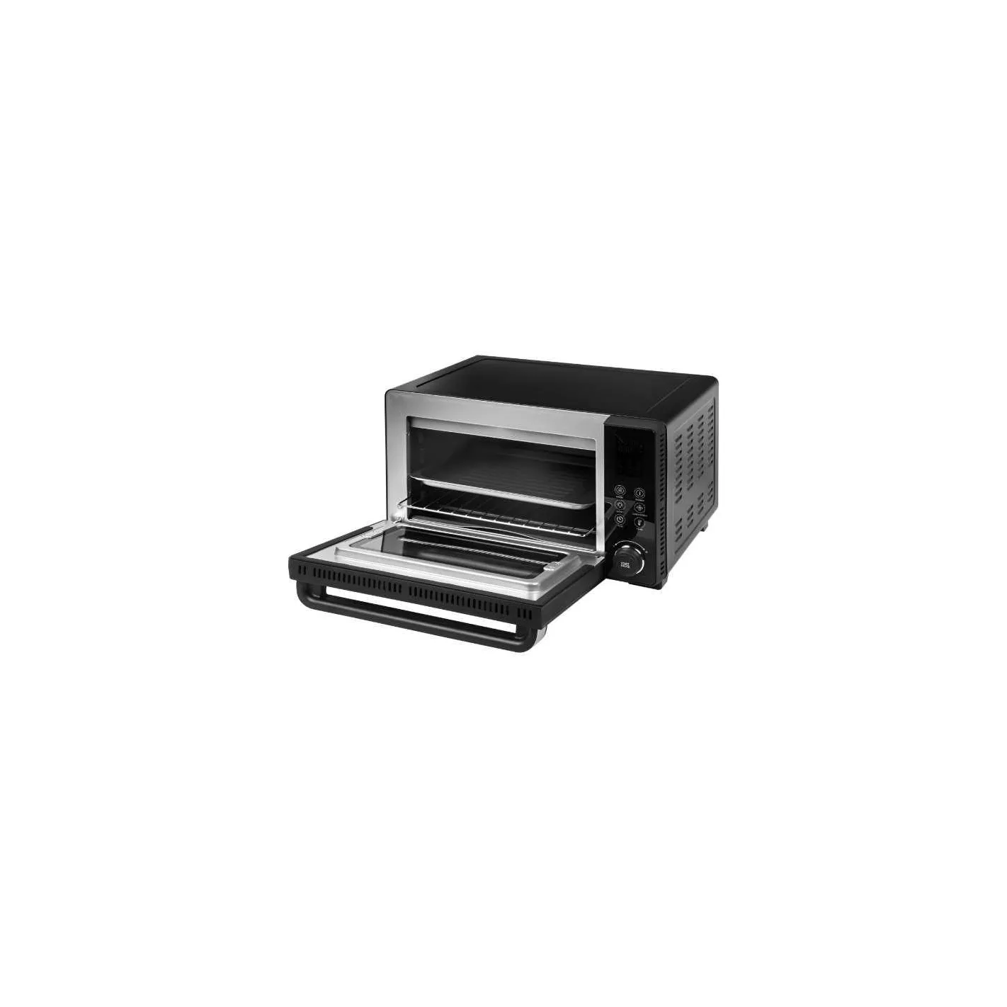 Puerta de cristal de doble pared modos preestablecidos: Asar, Hornear, Pizza, Cocción lenta, Fermentación, Descongelar, Recalentar Accesorios incluidos: Asa para bandeja, rejilla, bandeja para hornear y bandeja recoge gotas.