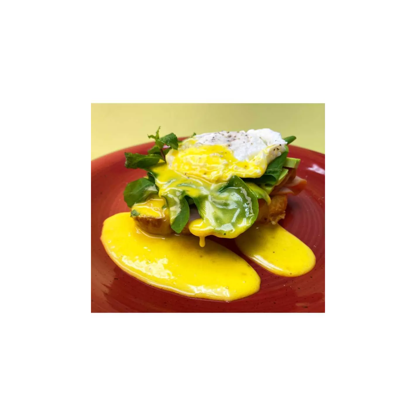 5-En una sartén a fuego medio tostar el pan, calentar el jamón, montar el aguacate sobre el jamón, arugula, el huevo y por último la salsa holandesa.