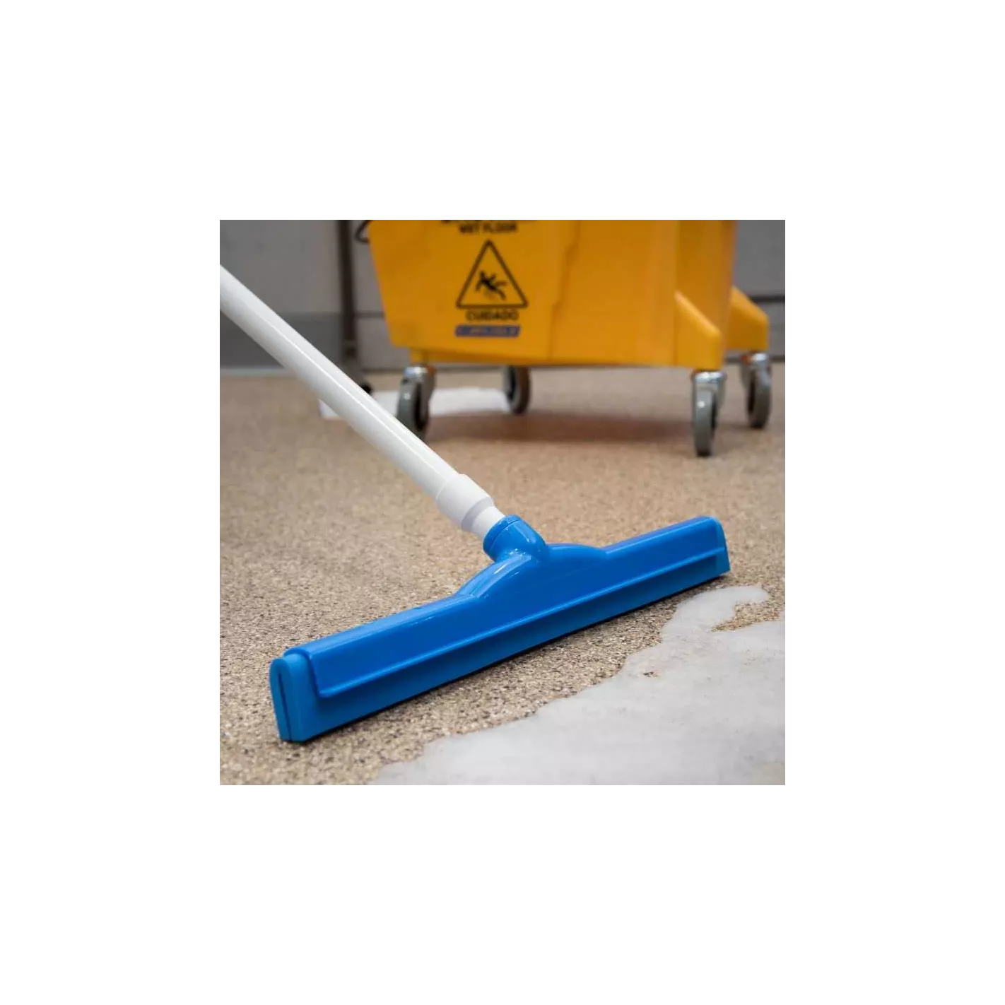 Este Hule para limpíar pisos de Carlisle en color azul es especial para la limpieza en su cocina. Tiene un marco con hule que mide 18 pulgadas, ademas tiene una cuchilla integrada que elimina las costuras para resistir el crecimiento bacteriano y facilitar el saneamiento. Tiene un marco de plástico para resistir la corrosión y la flexión y una cuchilla doble de goma espuma para absorción. Es segura para usar en pisos de baldosas y mármol, y el material no provocará chispas al limpiar fluidos inflamables. La escobilla de goma acepta un mango roscado estándar.