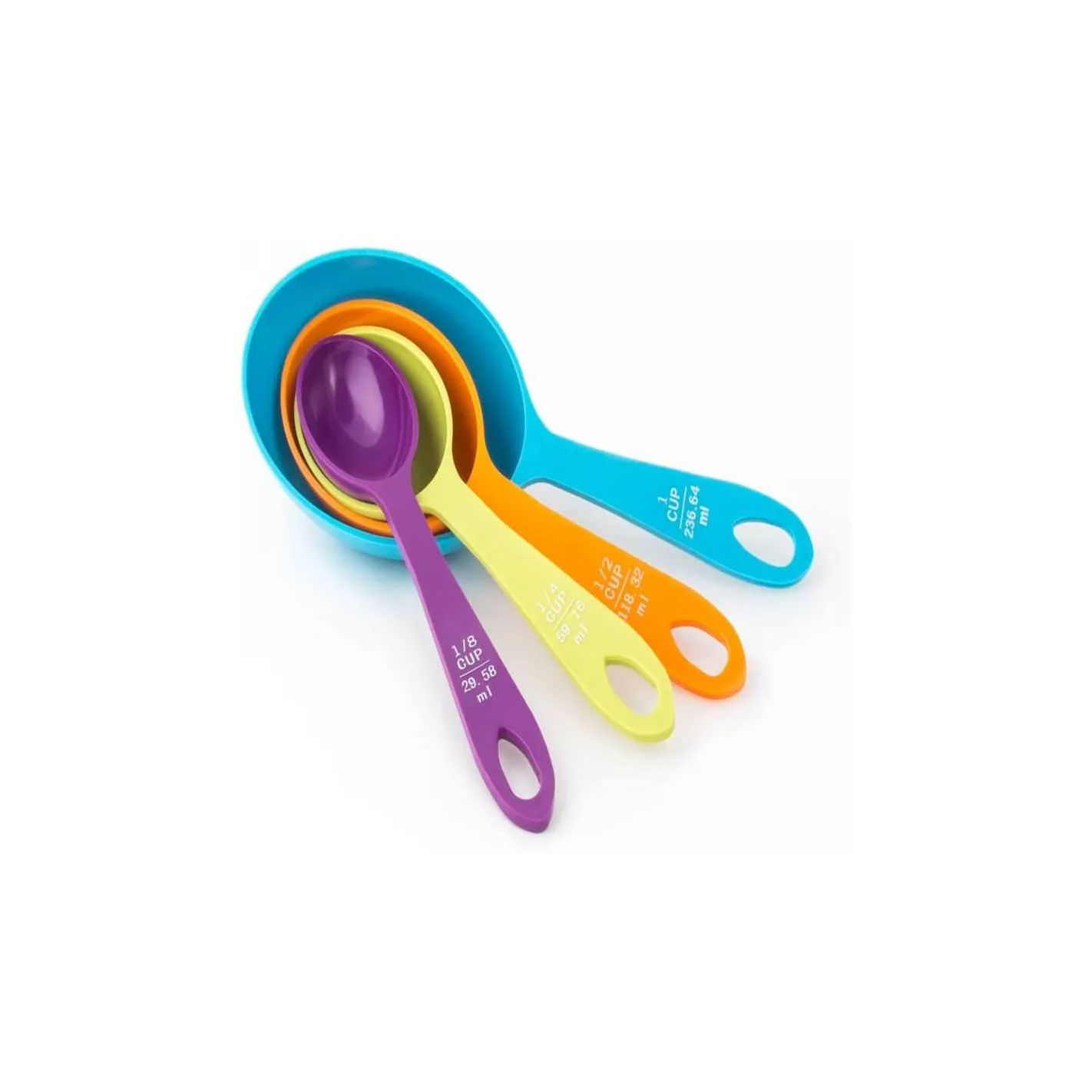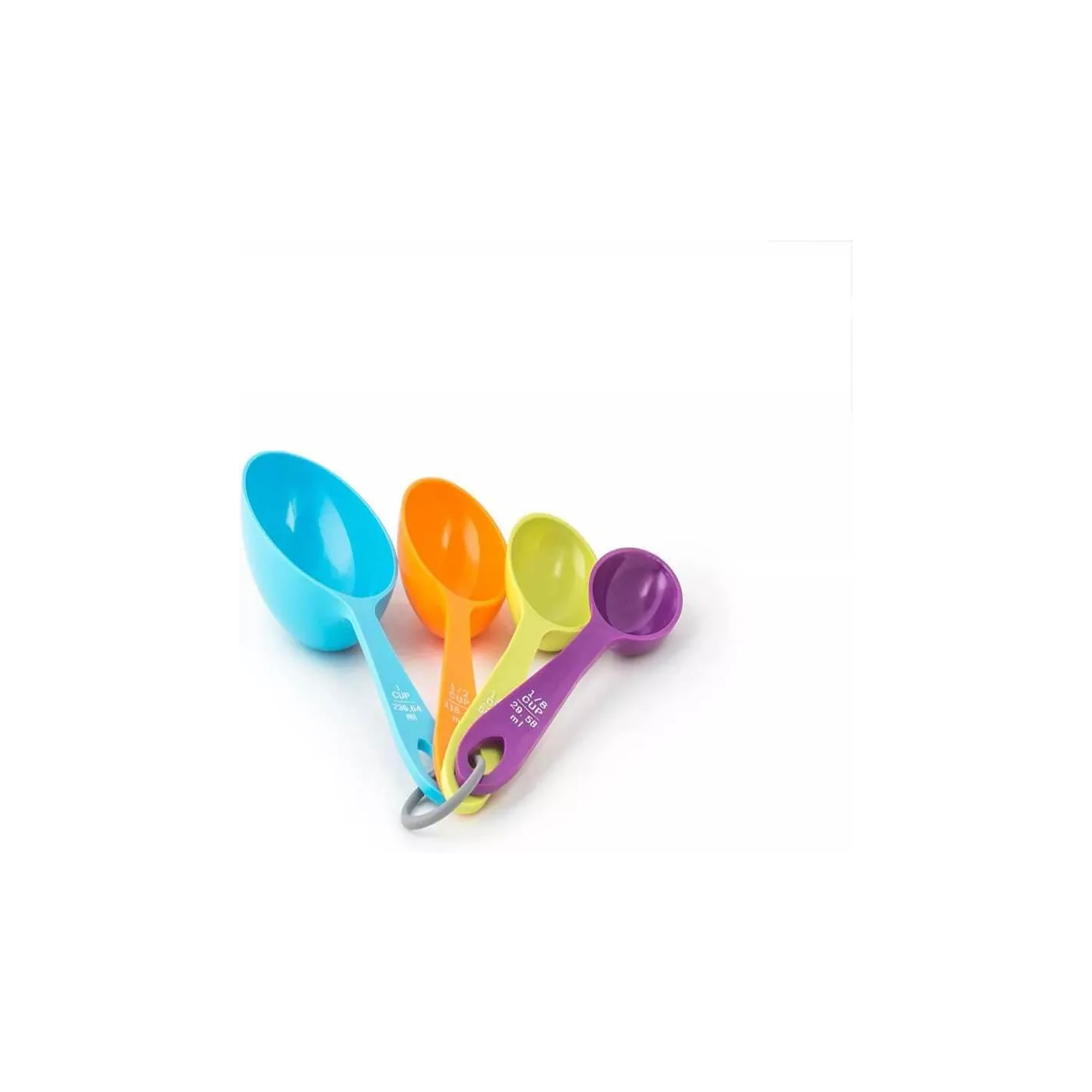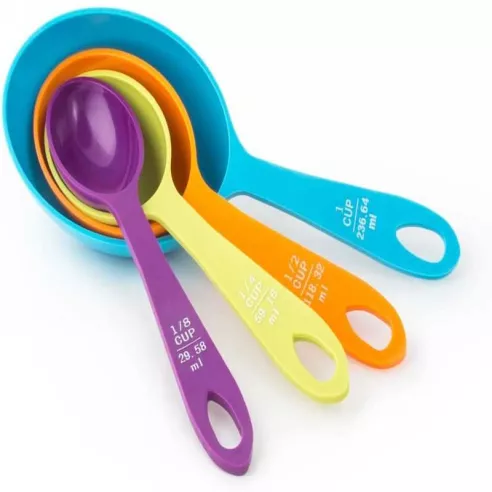 ¡Mide con estilo! Este juego de tazas medidoras presenta un diseño único que hace que la medición sea más fácil que antes. La forma innovadora le permite sacar ingredientes fácilmente de botes, bolsas y frascos altos. Construido con plástico ABS duradero, este conjunto de cuatro tazas de colores brillantes incluye: 1/4 taza, 1/3 taza, 1/2 taza y 1 taza, todas convenientemente unidas. Busque el juego de cucharas a juego de Fox Run para un emparejamiento completo. Mida con precisión para obtener resultados de horneado perfectos.