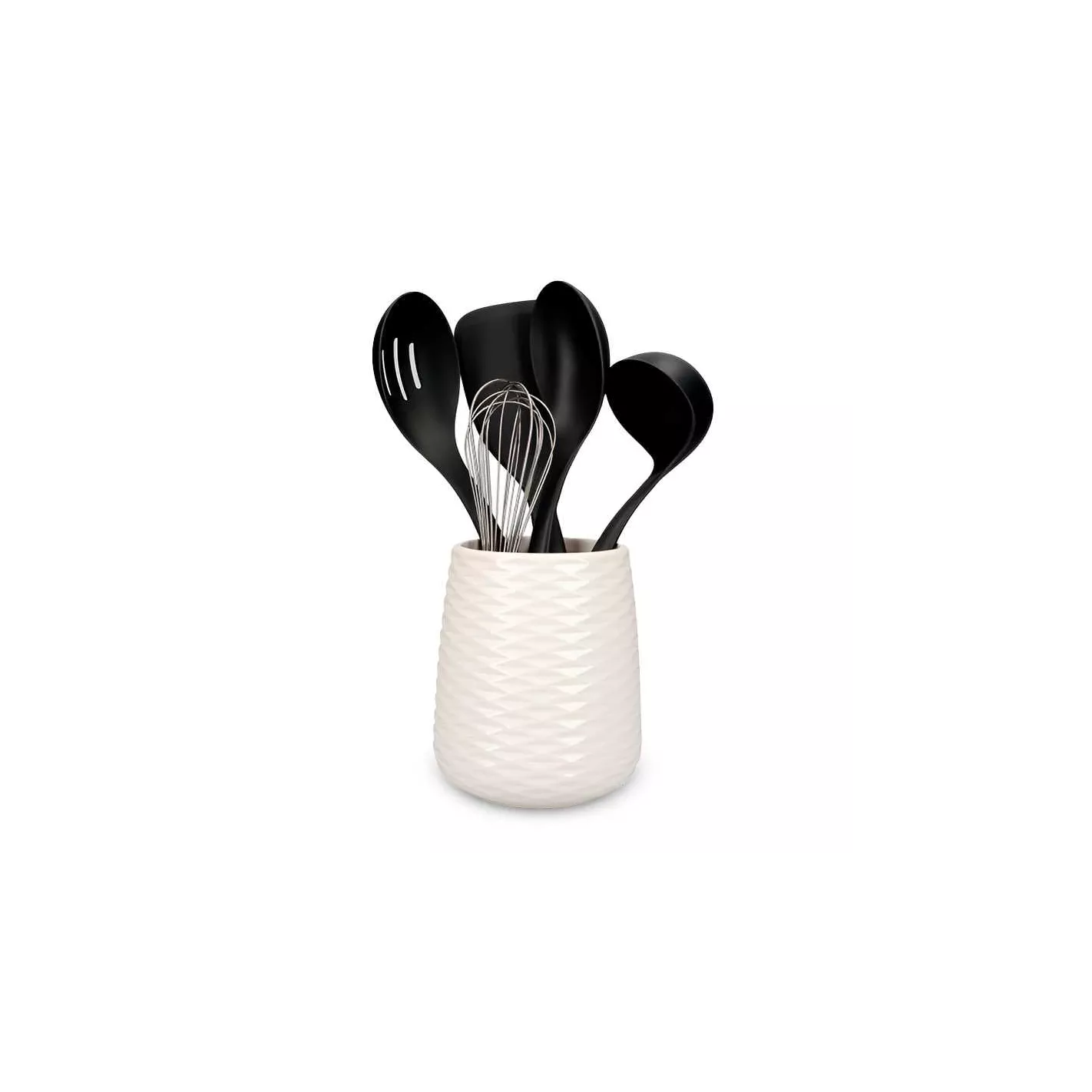 Este juego de utensilios de cocina de 6 piezas de KitchenAid incluye una espátula sólida, una cuchara para cocinar, una espumadera, un cucharón, un batidor de globo y un soporte de cerámica para utensilios. Las herramientas son resistentes, duraderas y seguras para todos los utensilios de cocina, incluidos los antiadherentes (excepto el batidor). Los cabezales son resistentes al calor hasta 232 °C/450 °F.