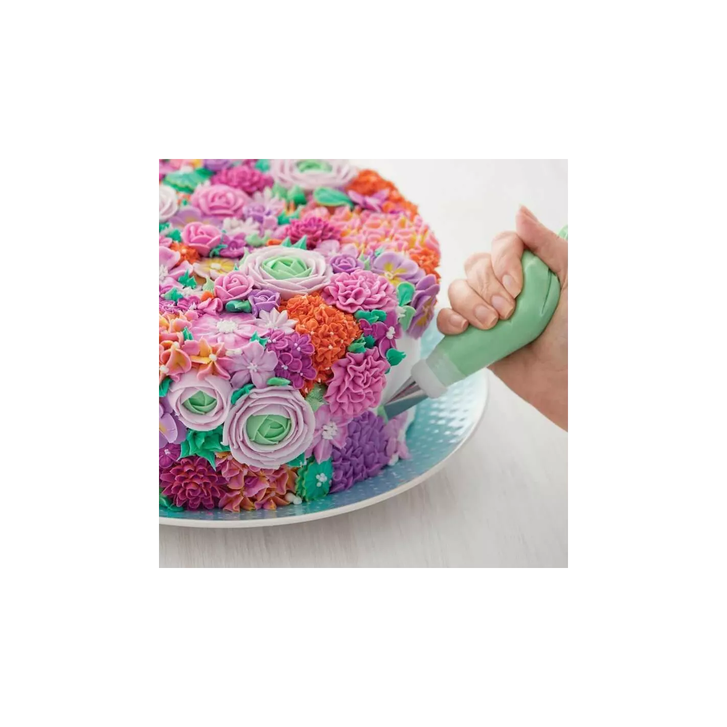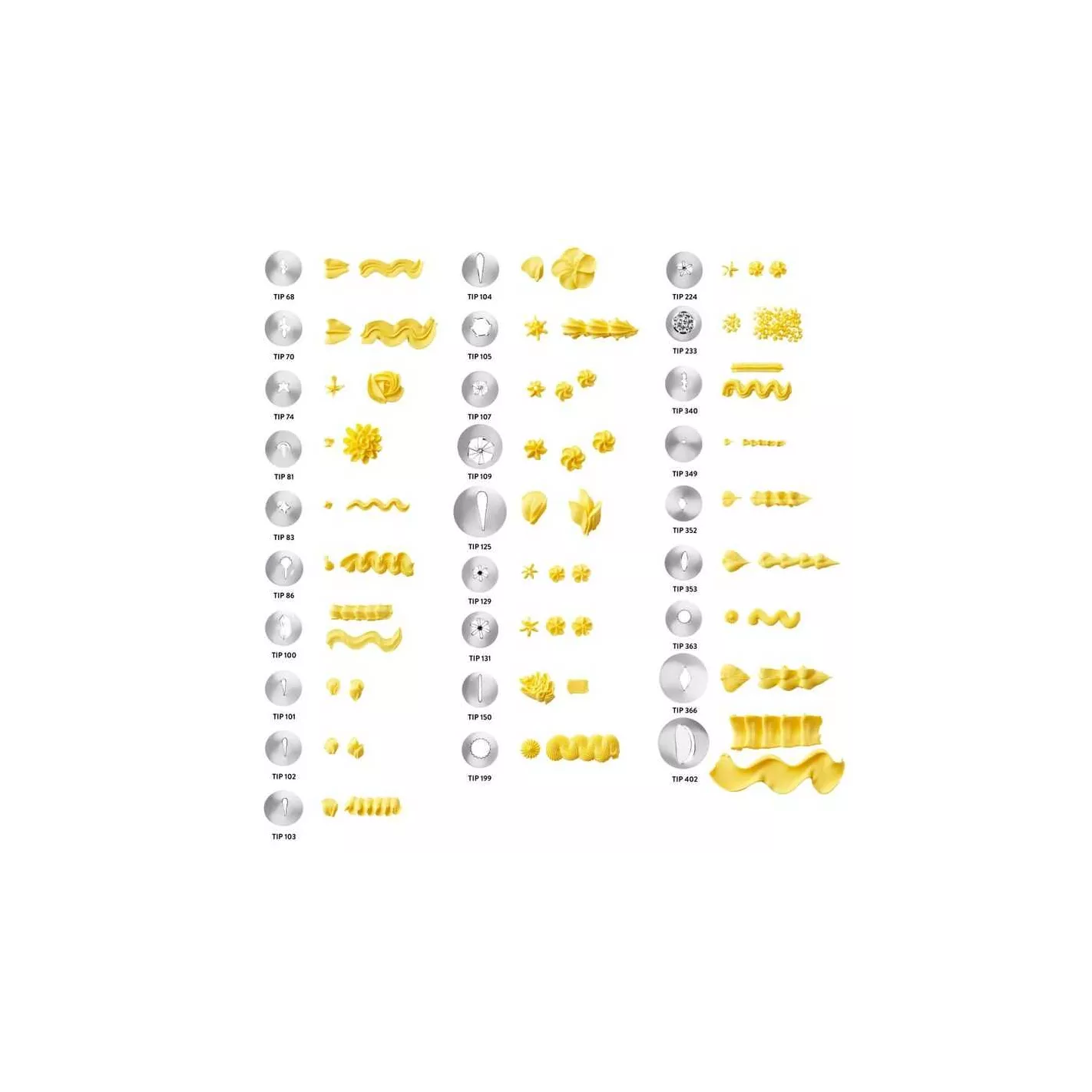 Es el juego de boquillas para decorar pasteles para cualquier decorador, todo en un práctico estuche organizador de plástico. El juego incluye: 55 boquillas de decoración (Redondas 1, 2, 2A, 3, 4, 5, 6, 7, 8, 10, 12; Estrella 4B, 14, 16, 18, 21, 27, 30, 32, 54, 199, 363; Hoja 66, 67, 68, 70, 74, 349, 352, 366; Ruffle 86, 100, 340, 353, 402; Pétalo 101, 102, 103, 104, 125, 150; Flores 2D , 107, 109, 129, 131, 224; Especiales 2B, 44, 47, 81, 83, 105, 233), dos acopladores estándar y dos clavos de flores (1.25 pulgadas cada uno).