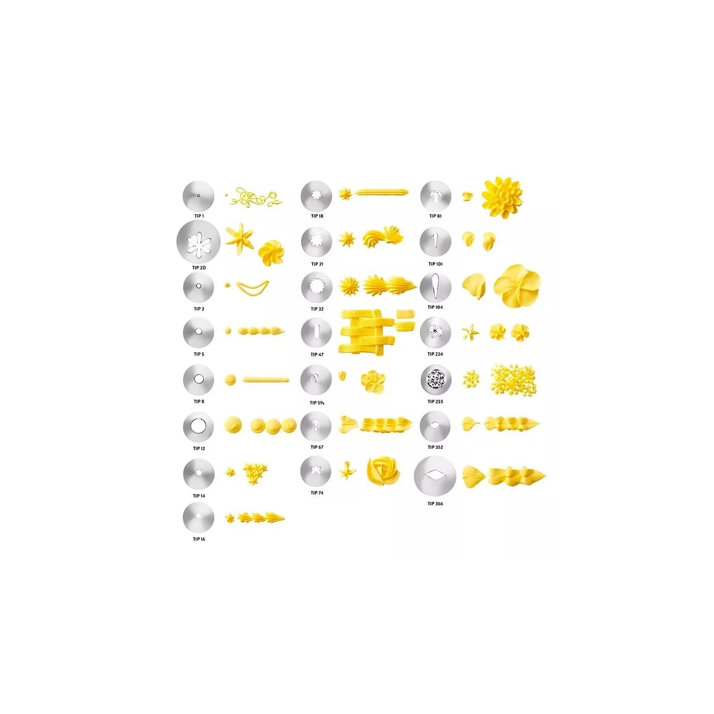 El juego incluye: 22 boquillas de decoración (Redondas 1, 3, 5, 8, 12; Estrella 14, 16, 18, 21, 32; Hoja 67, 74, 352, 366; Pétalo 59s, 101, 104; Flores 2D, 224 ; Especialiales 47, 81, 233) más un acoplador estándar y clavo de flores (1.25 pulgadas).