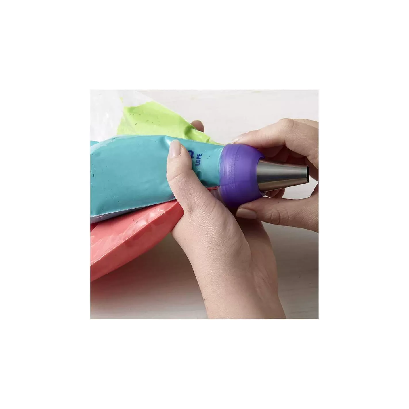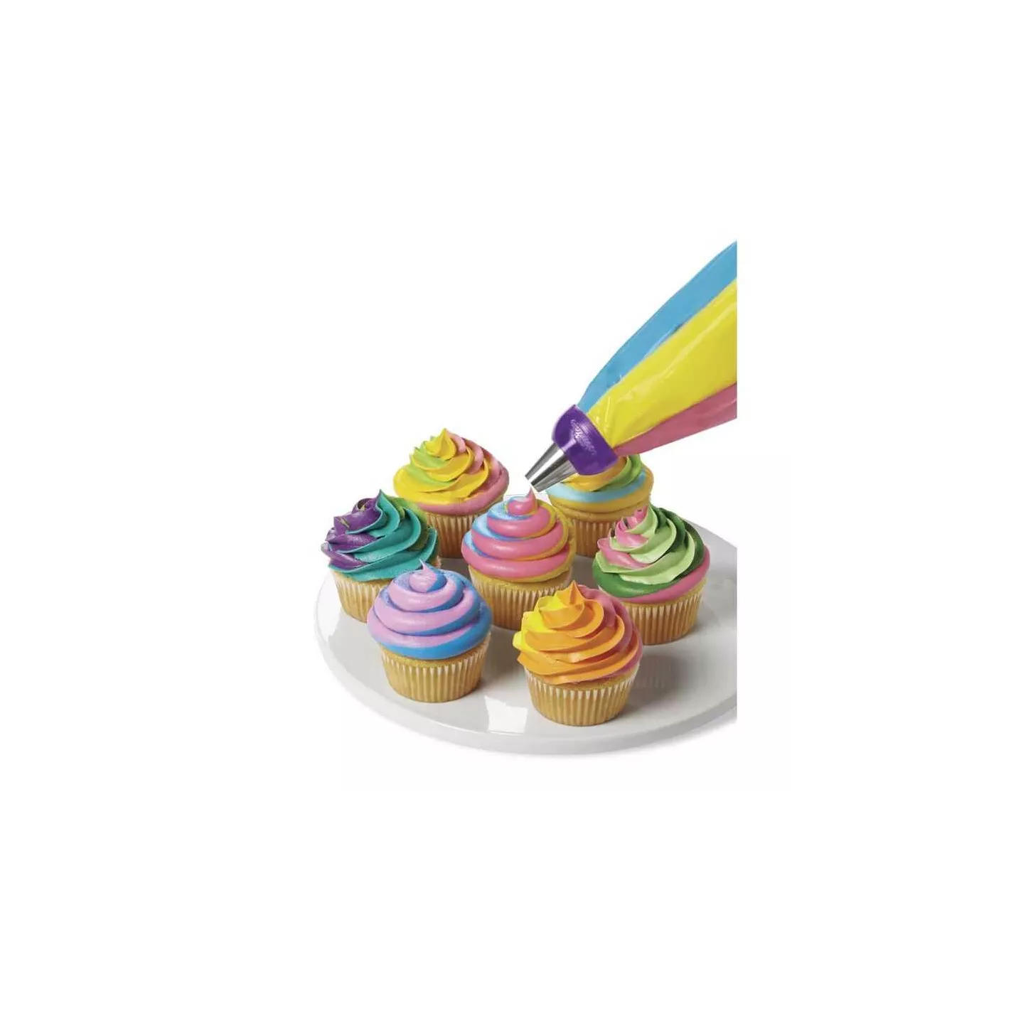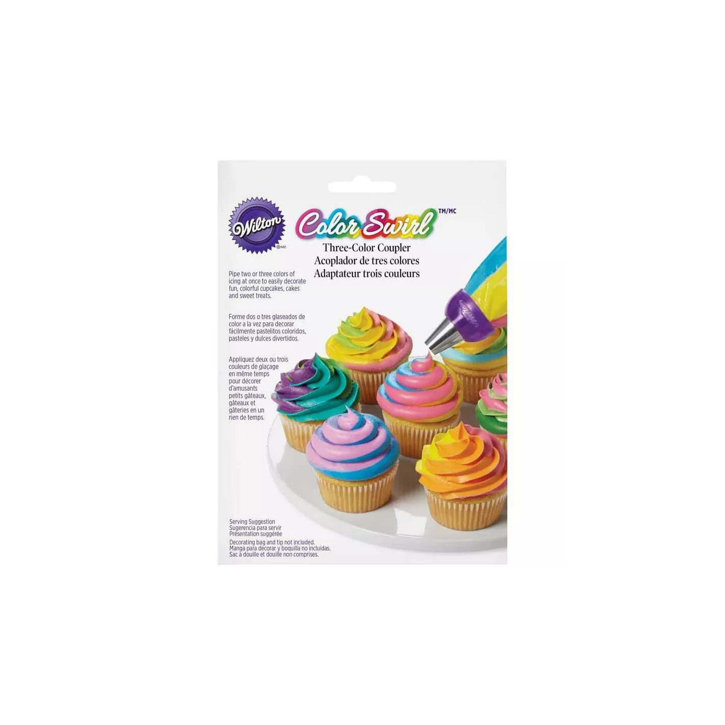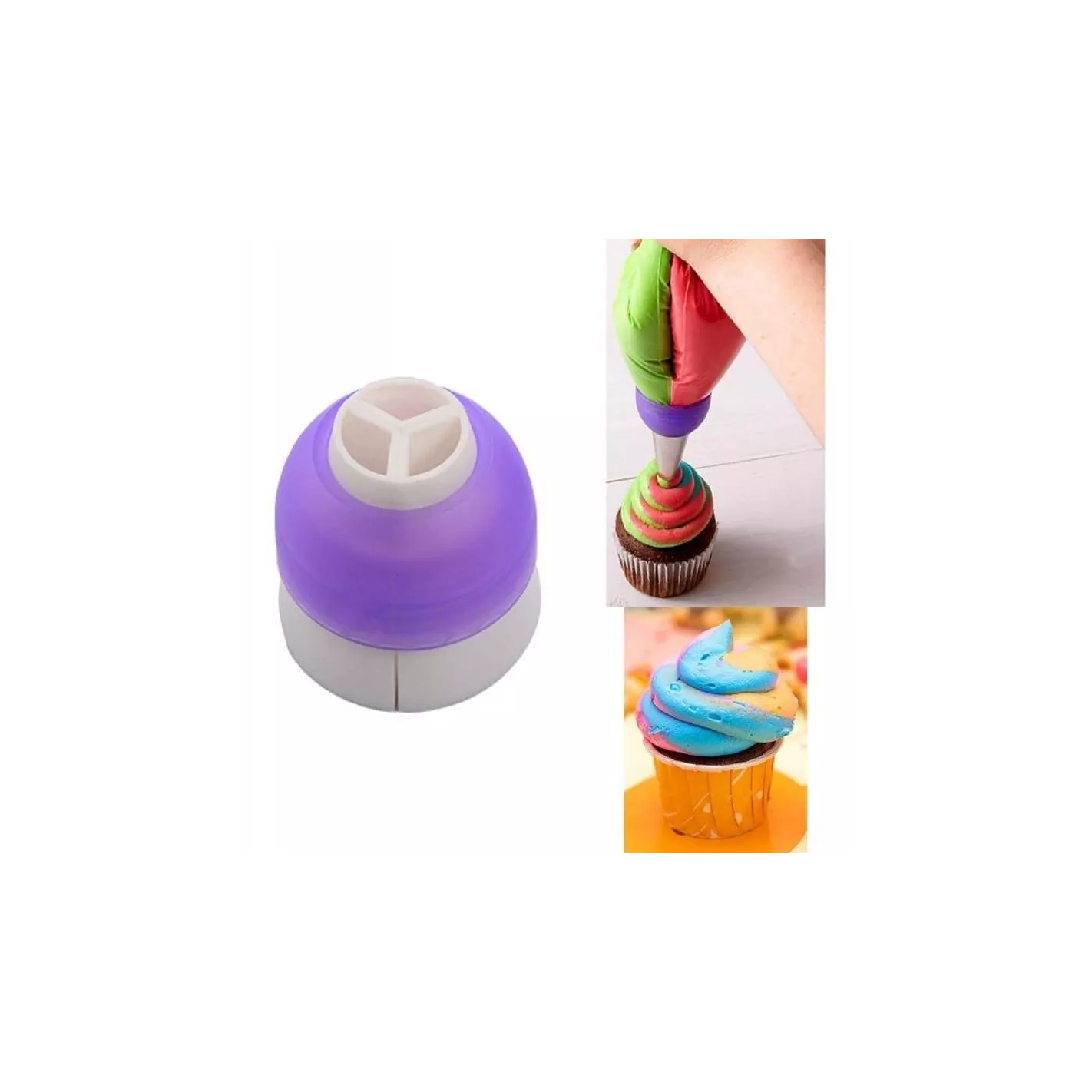 El acoplador de 3 colores Color Swirl combina a la perfección 2-3 colores de glaseado a medida que canaliza. Elija entre colores de remolino doble o triple remolino. Las piezas de acoplamiento entrelazadas conectan múltiples bolsas de decoración, lo que le permite girar 2 o 3 colores juntos con un simple movimiento. Simplemente conéctelo y asegúrelo con el anillo incluido. El acoplador de 3 colores entrelaza 3 bolsas de decoración en su lugar para que pueda decorar fácilmente pasteles, cupcakes y otros dulces en varios colores.