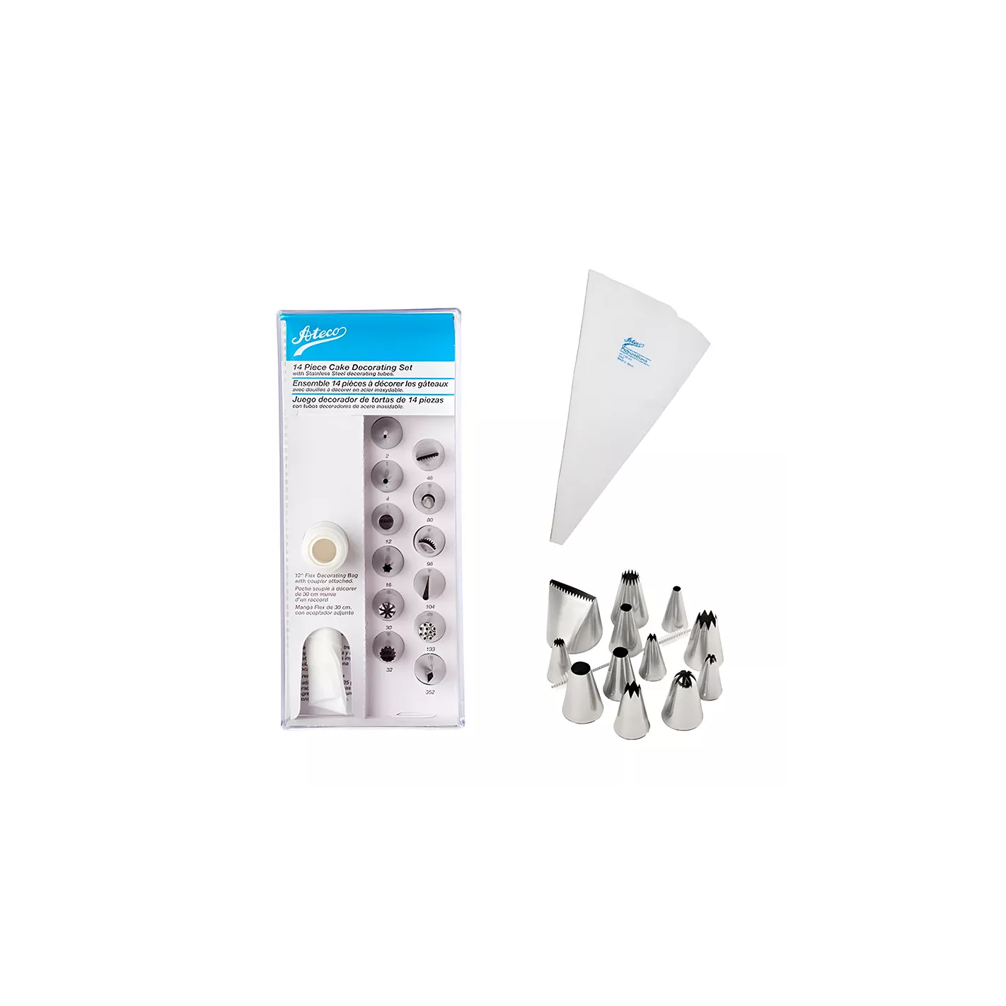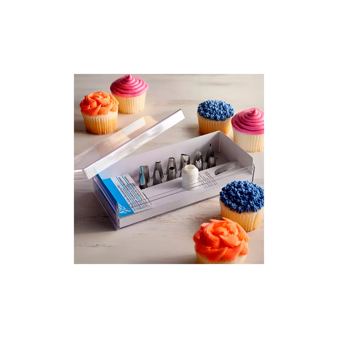 Todo un set de decoración completo con una amplia variedad de boquillas junto con un tornillo para colocar en su manga. Viene en una cajita blanca de plástico de buena calidad para poder mantener el orden de sus herramientas de decoración.