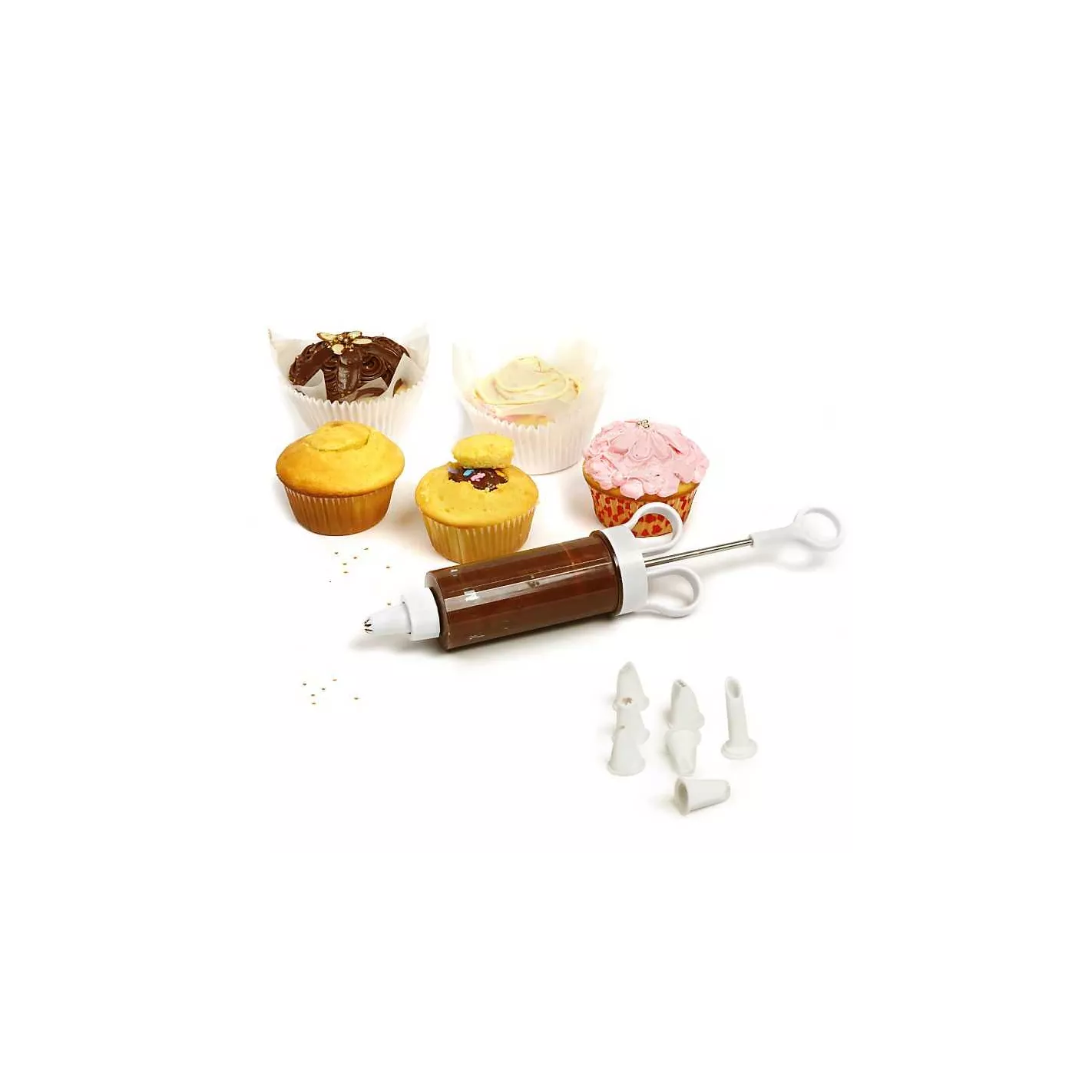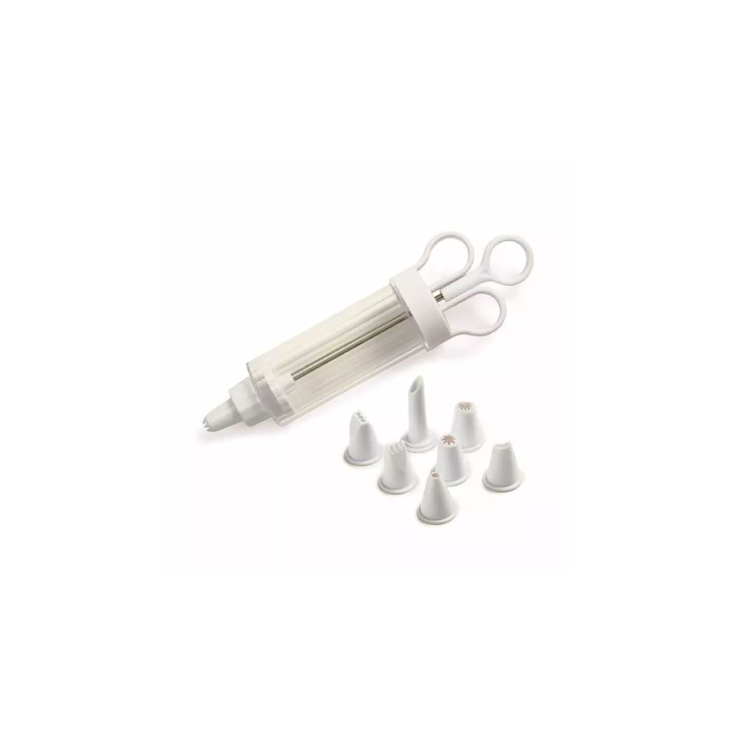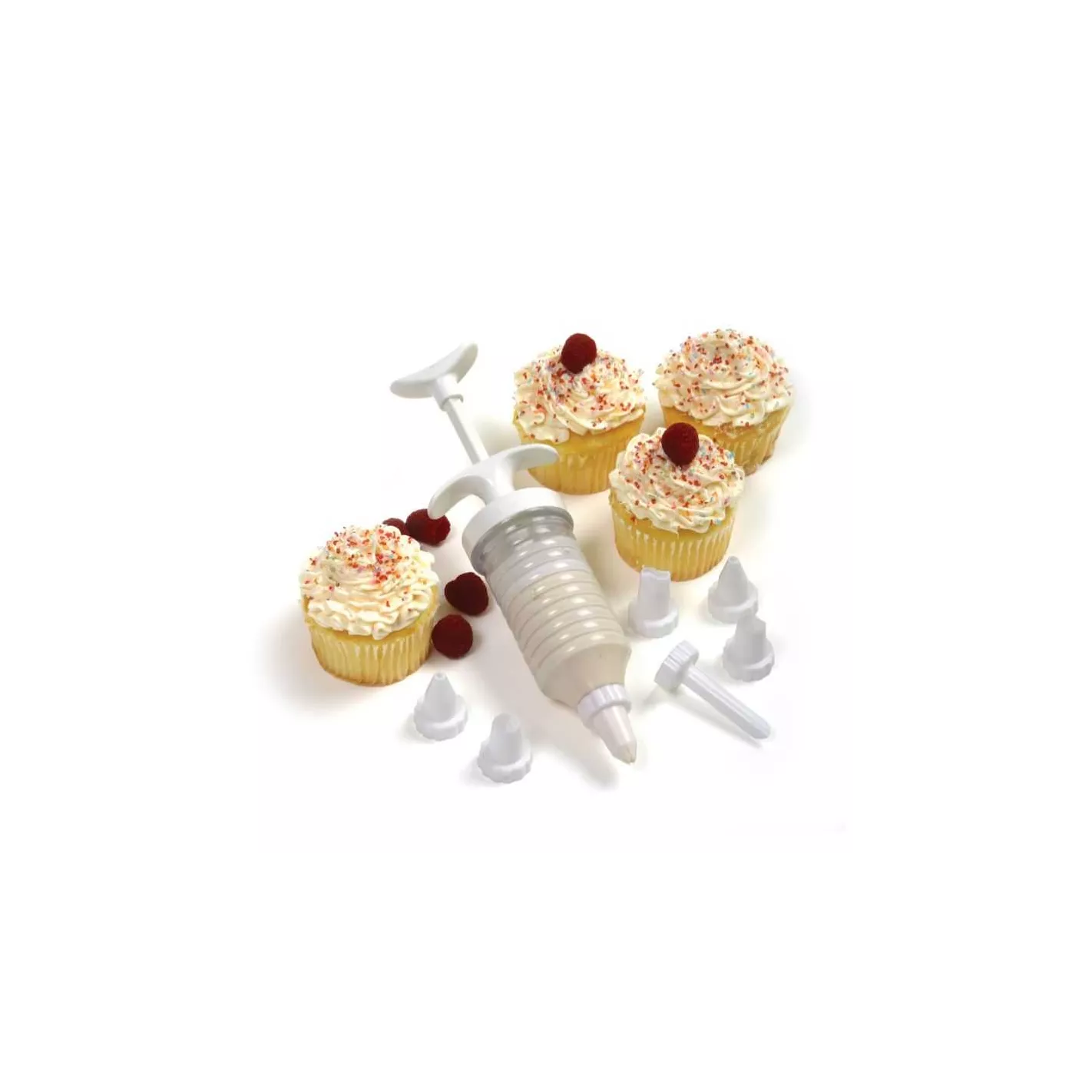 Este set de 9 piezas incluye una jeringa decorativa que contiene una medida de una taza de su relleno favorito y ocho puntas de glaseado. Con una capacidad de 120 mililitros, medidas 7.5 x 2.5 x 1.5 pulgadas / 19 x 5 x 4 centímetros. Hecho de material plaático