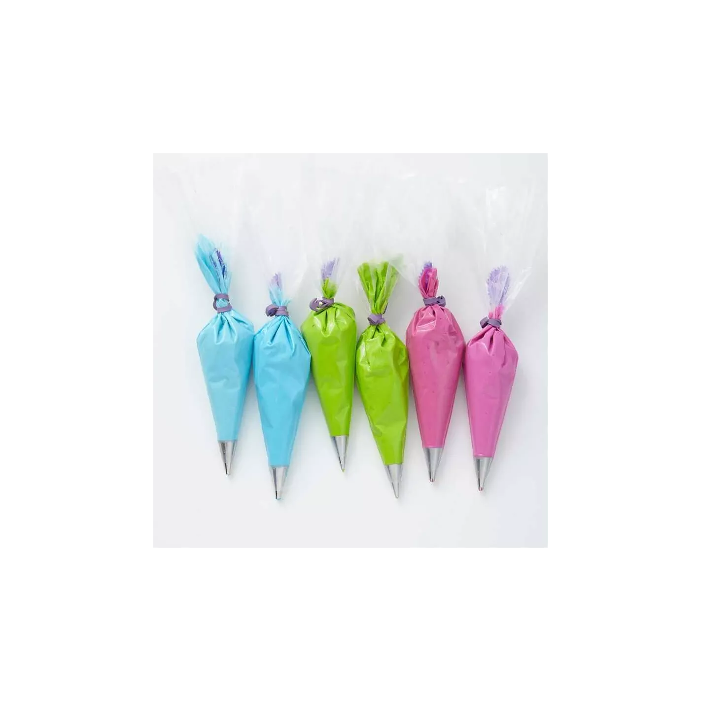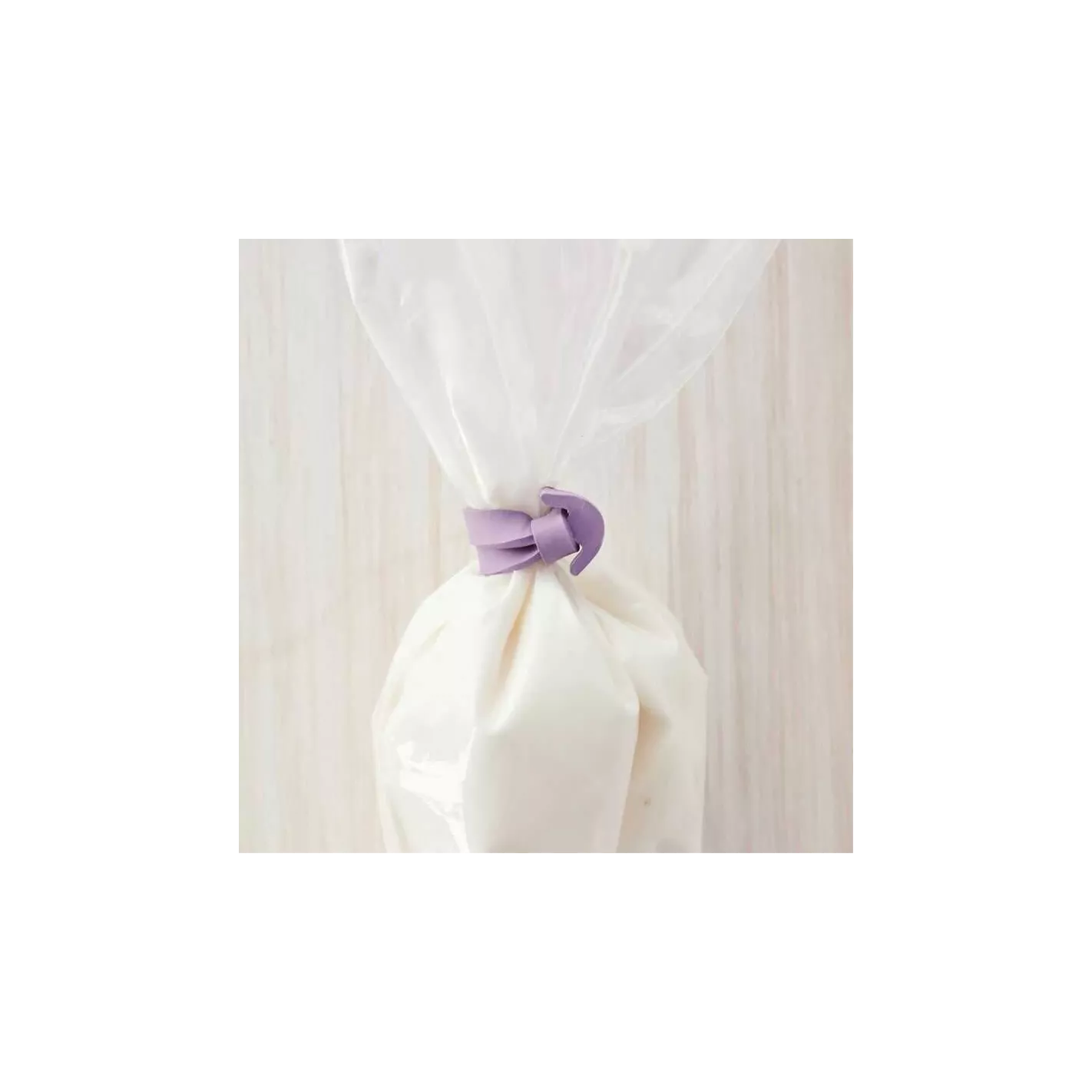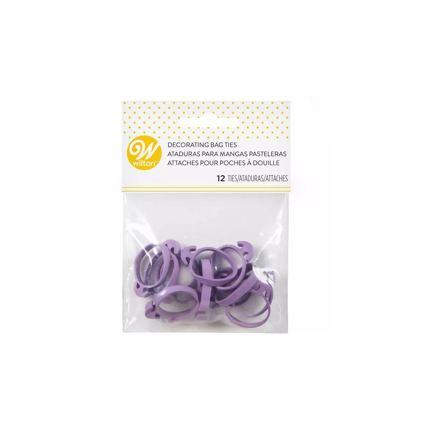 Nunca más se preocupe por la formación de glaseado que salga de su bolsa de decoración con estos lazos de goma púrpura Wilton. A medida que exprime la formación de glaseado, deslice la atadura de la bolsa hacia abajo para mantener la presión. Funciona muy bien con los dulces derretidos, o cualquier cosa que necesites sacar de una manga, ideal para los niños. El paquete incluye 12 amarras.