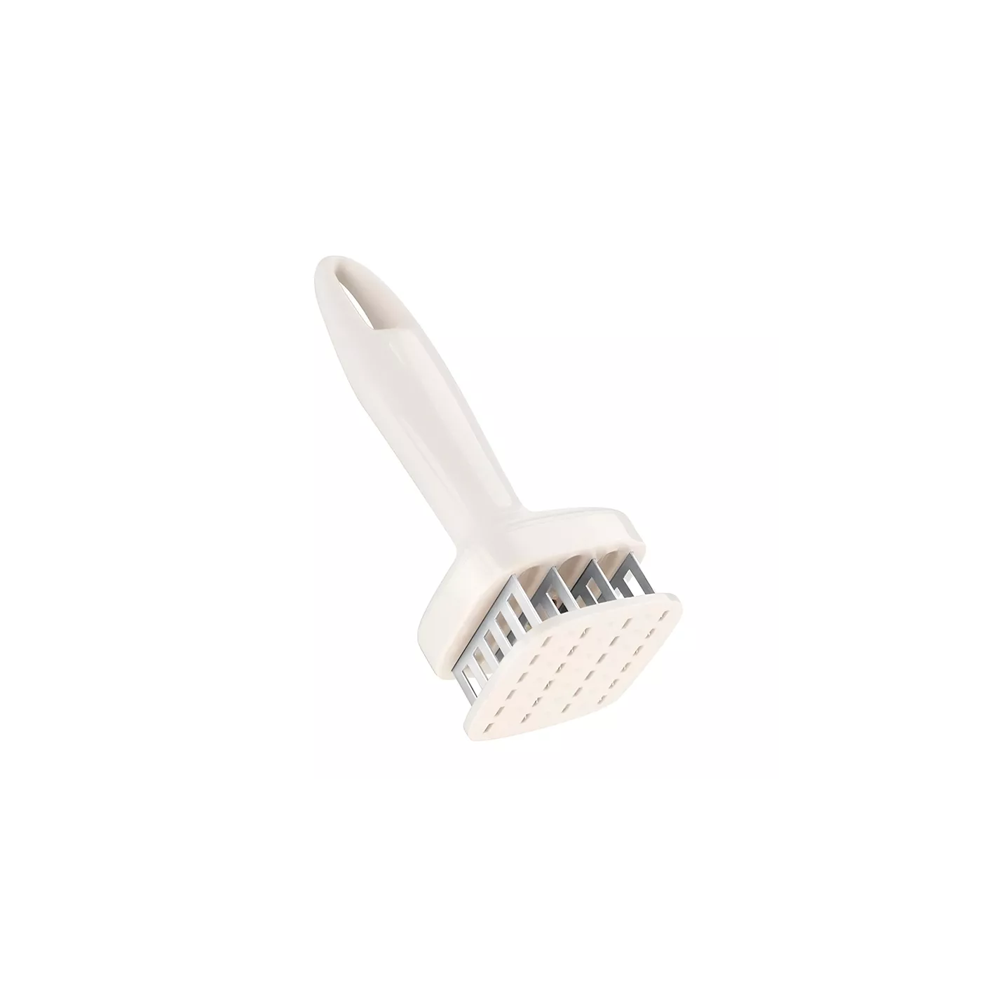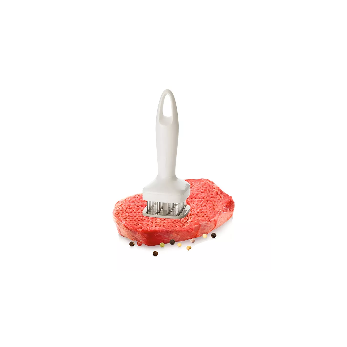 Excelente para hacer bistecs jugosos y ablandar todo tipo de carnes rojas. Coloque el ablandador en una rebanada de carne cruda, presione el asa y repita este proceso en todo el bistec. Lave con agua corriente. Dejar en remojo cuando sea necesario.
