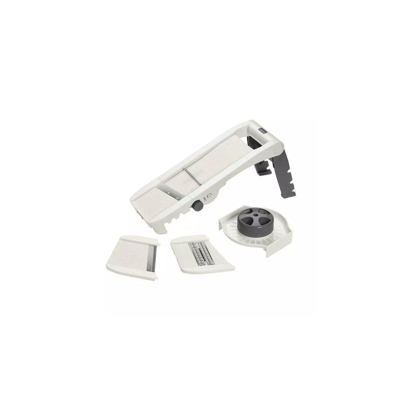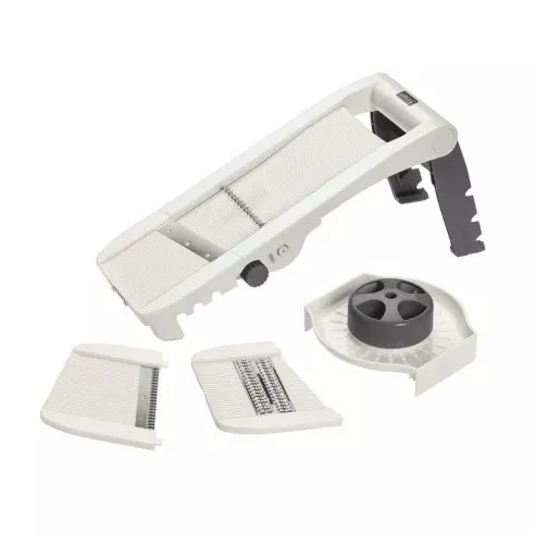 Utensilio de cocina versátil y eficiente diseñado para cortar, rebanar y laminar alimentos con precisión y rapidez. Gracias a sus cuchillas intercambiables y su sistema ajustable, permite obtener distintos tipos de cortes, como rodajas finas, julianas o cortes gruesos, facilitando la preparación de frutas, verduras y otros ingredientes. Es ideal tanto para chefs profesionales como para entusiastas de la cocina en el hogar.