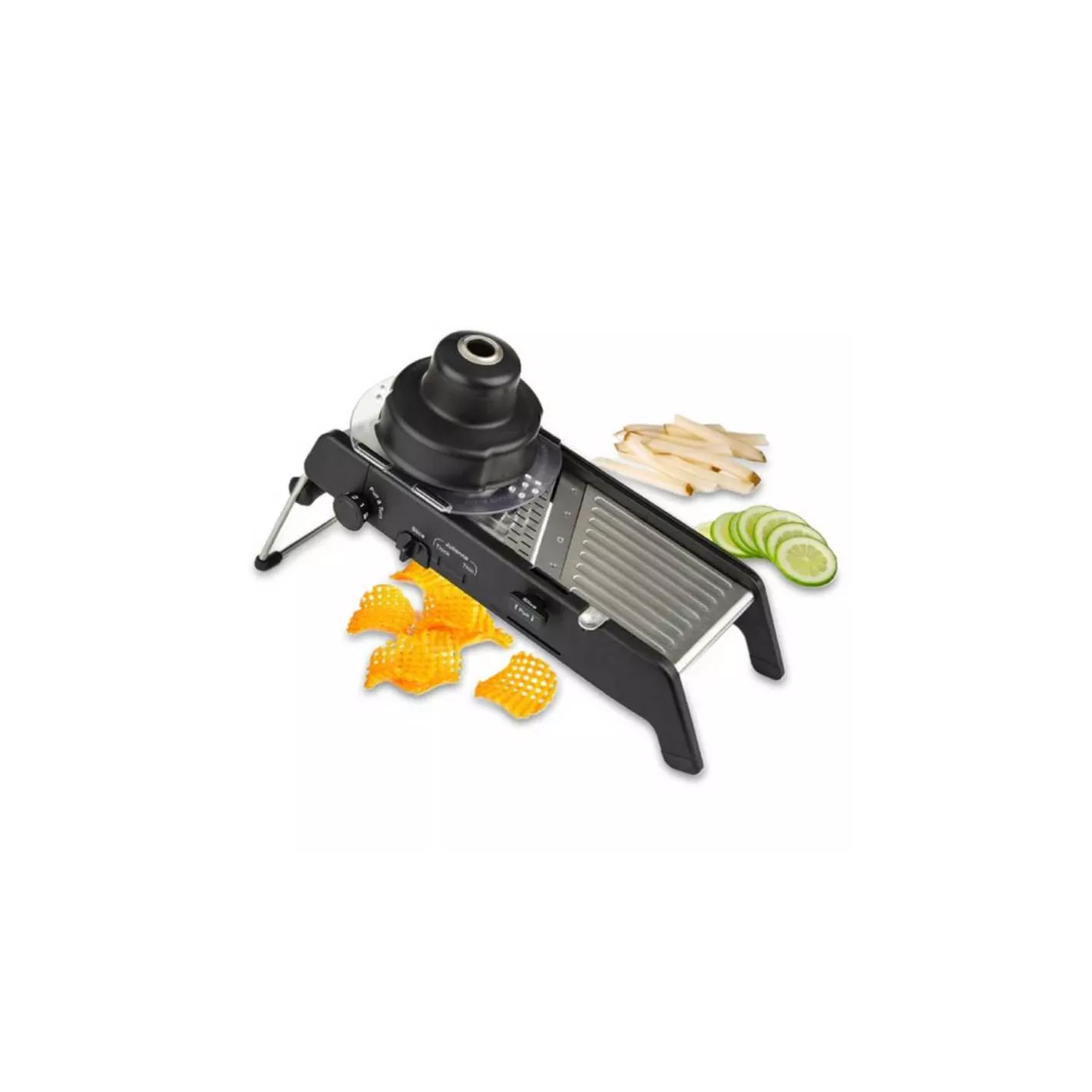 Esta mandolina cuenta con una perilla de ajuste de la cuchilla para un cambio continuo entre las cuchillas incorporadas para rebanar y para gofres, eliminando las cuchillas o piezas sueltas. Con un giro rápido de la muñeca, puede crear cortes de gofres que seguramente impresionarán a cualquier invitado. El nuevo protector de mano con resorte proporciona una presión constante para un corte perfecto