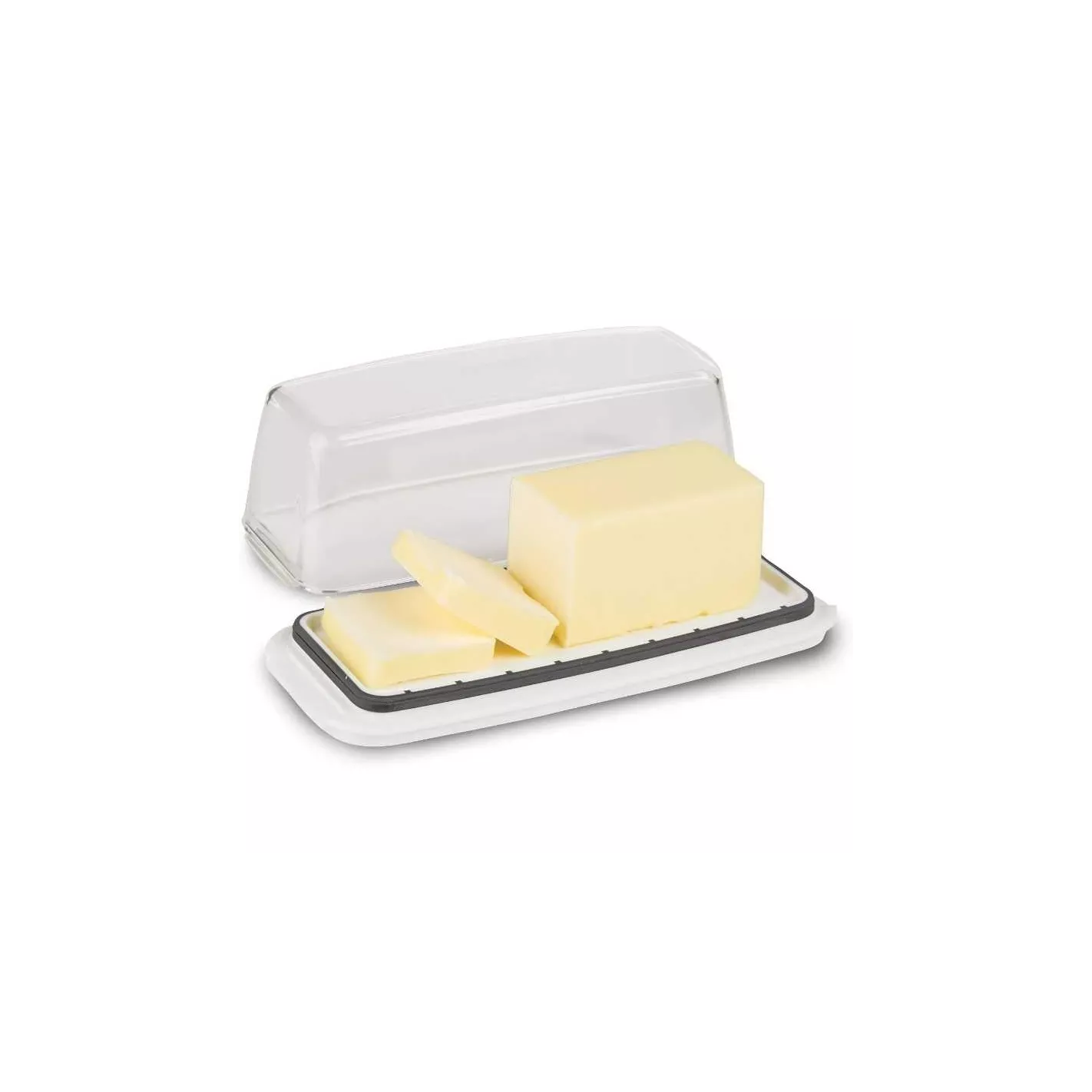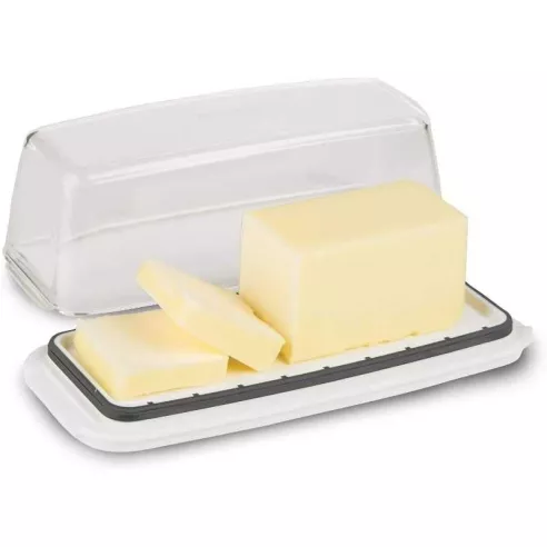 Tiene una tapa transparente con un sello de silicona en la base que crea un sello hermético que mantendrá la mantequilla fresca durante más tiempo. También cuenta con marcas de medición para barras cortas y largas de mantequilla de hasta 8 cucharadas. Se puede utilizar tanto dentro como fuera del refrigerador y es libre de BPA y apto para lavavajillas.