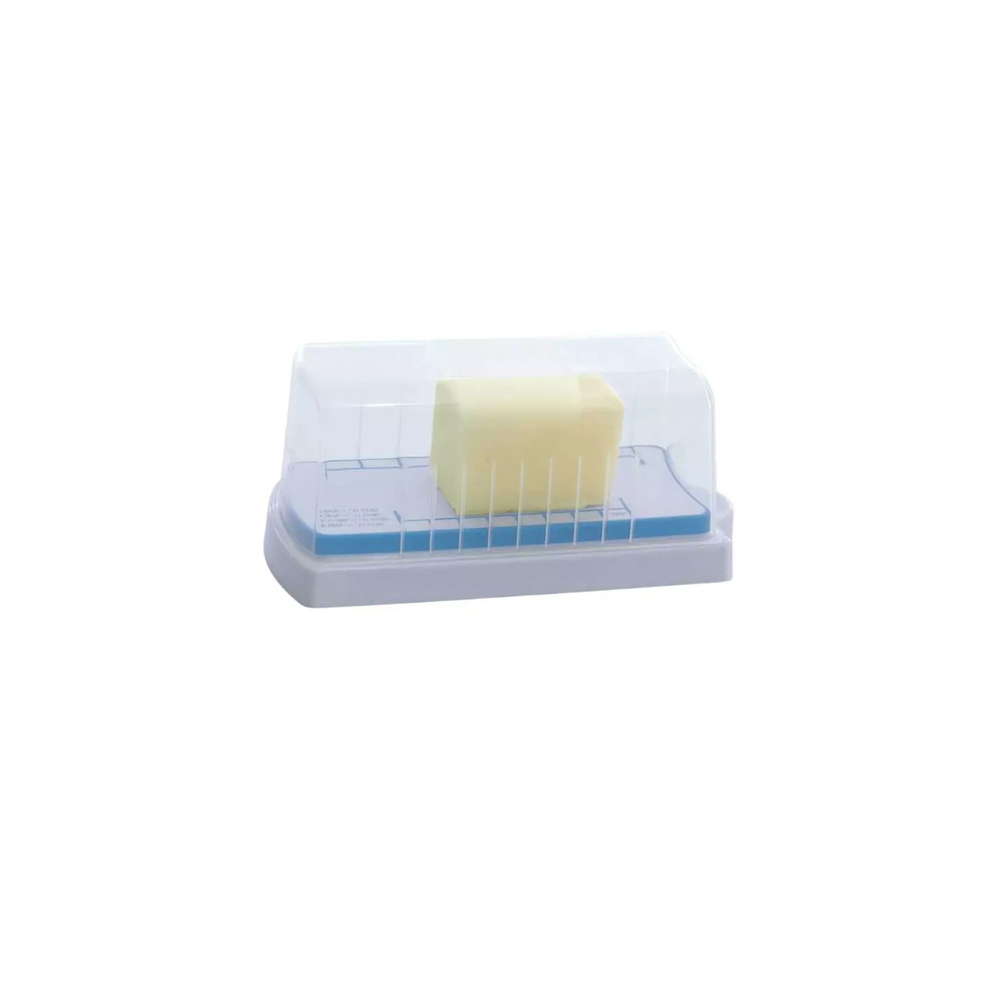 Mantequillera de plástico. Base blanca y azul con tapa hermética transparente. Mediciones marcadas en la base. El diseño ancho tiene palos estrechos, cortos y anchos. Sostiene 1 barra de mantequilla. Apta para el lavavajillas.