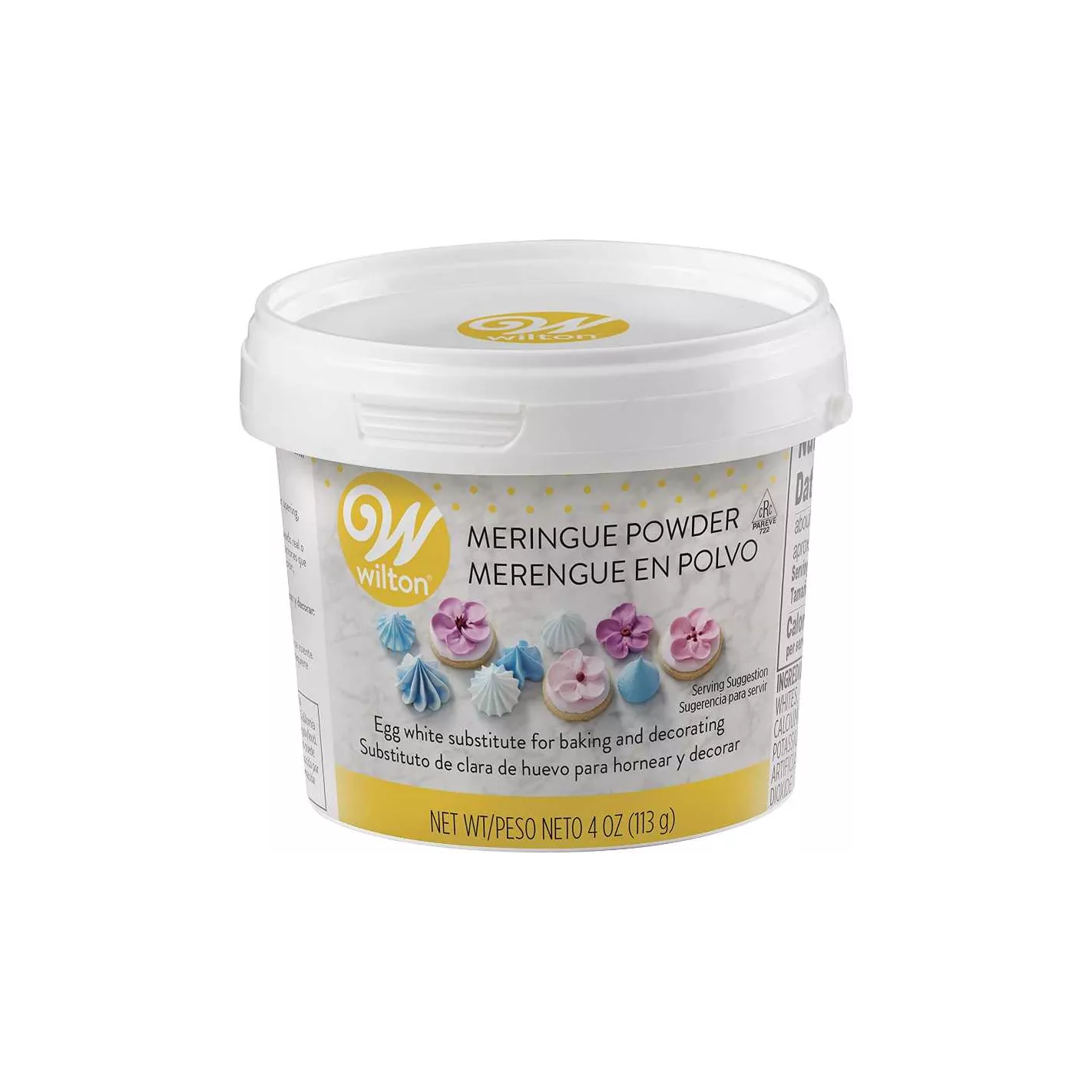 Merengue en polvo, 4 onzas. Principal ingrediente para el glaseado real. Estabiliza la crema de mantequilla, agrega cuerpo a la formación del glaseado y merengue. Reemplaza las claras de huevo en muchas recetas. La tapa sellable se abre para facilitar la medición.