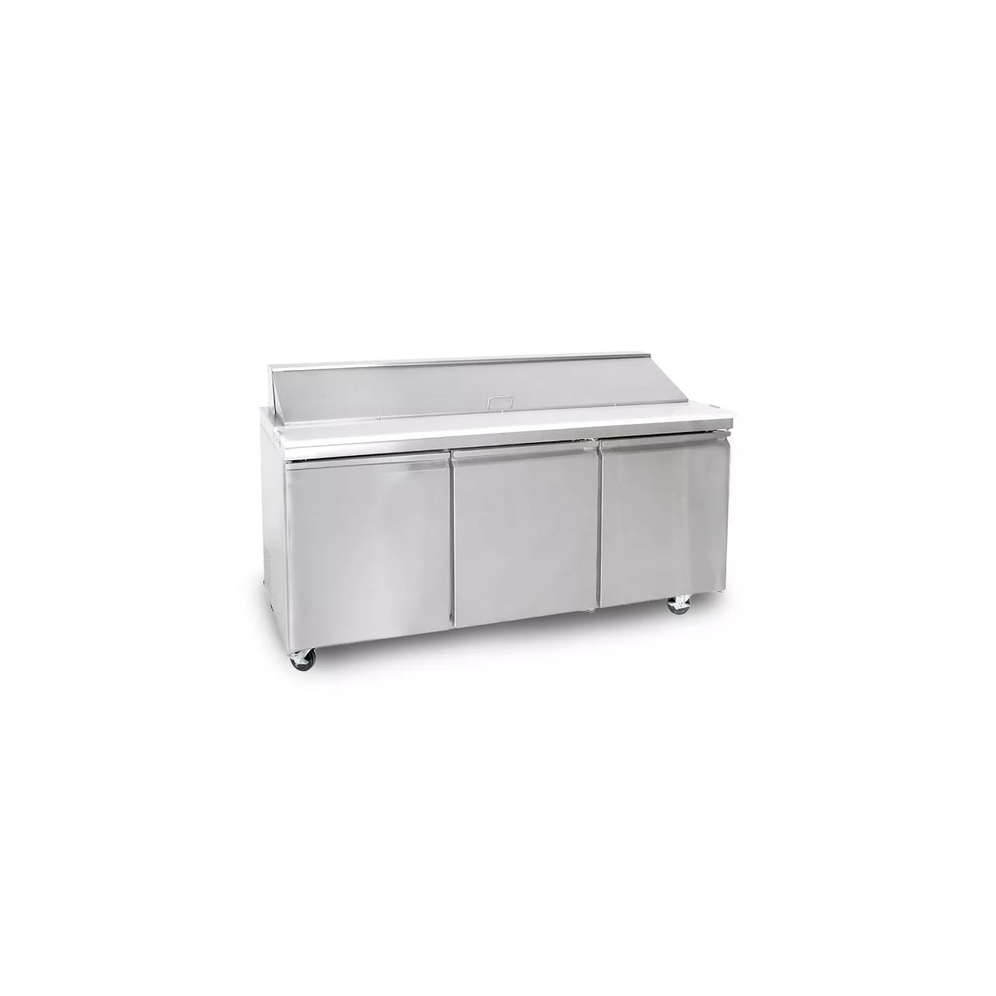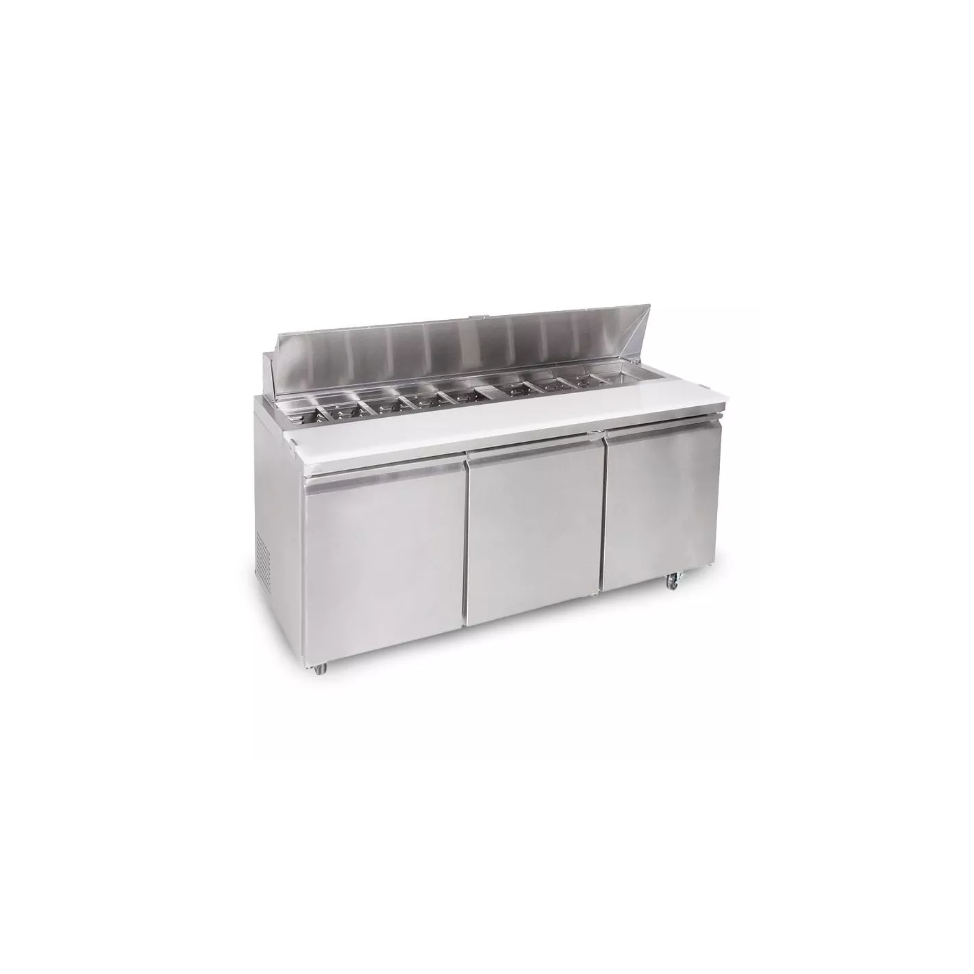 Las mesas de preparación para ensaladas y sándwiches de U-Star están construidas de acero inoxidable resistente tanto por dentro como por fuera, lo que las hace lo suficientemente fuertes y duraderas para sobrevivir en cualquier entorno de cocina. Almacene todos sus condimentos, carnes y verduras en el área de cobertura fría, puede contener una variedad de bandejas de diferentes tamaños de hasta 6 pulgadas de profundidad. La cubierta con bisagras aislada mantiene los alimentos fríos cuando no están en servicio. Almacene artículos adicionales en el gabinete para un acceso rápido cuando sea necesario. Todas las mesas de preparación para ensaladas y sándwiches vienen con ruedas de 6 pulgadas, estantes de alambre recubiertos de plástico y una tabla de cortar de polietileno de 3/4 de pulgadas de grosor. La lectura del LED frontal hace que sea fácil ver la temperatura interior. Estos modelos son Listado ETL y ETL Sanitation.