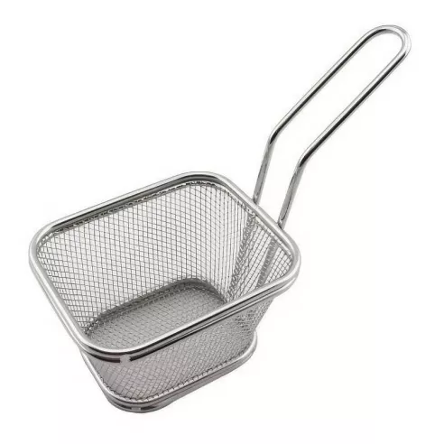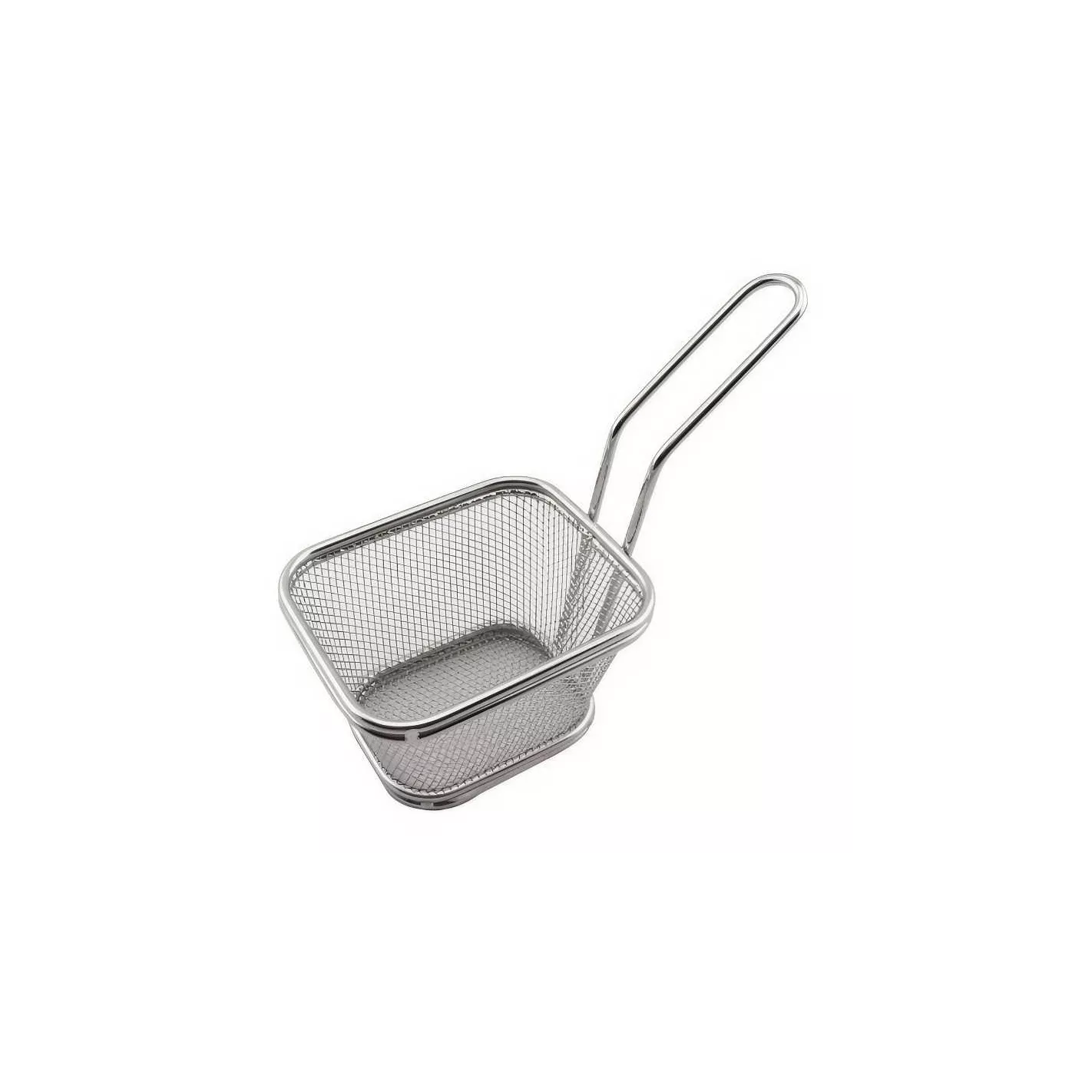 La mini canasta para snacks cuadrada está fabricada en acero inoxidable y su diseño es apto para servir papas fritas u otros fritos de la cocina, tiene un asa para sostener y servir fácilmente y sus dimensiones son: 10 x 8 x 2-1/2 centímetros. Canasta resistente a la corrosión y al uso constante.