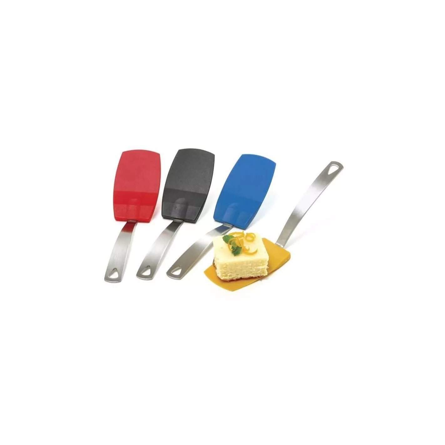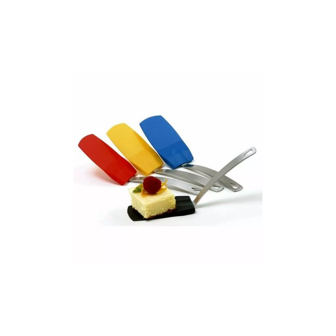 Espátula perfecta para sacar ese primer crujiente de brownie o arroz. Ideal para servir porciones pequeñas cabeza de silicona flexible que es resistente al calor a 450° F. Mango de acero inoxidable. Colores surtidos