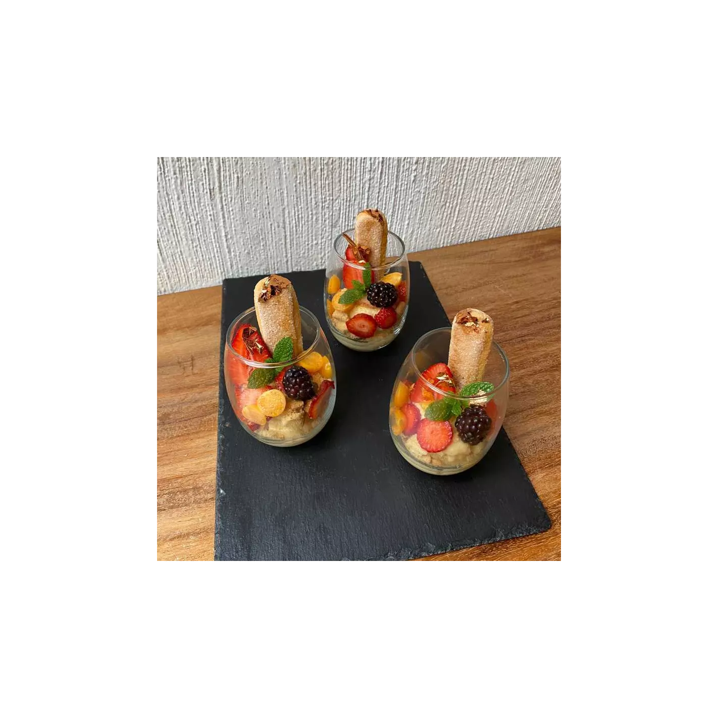 Alternar, cortado círculos de bizcocho y almíbar, crema 2 veces, colocar frutas frescas y dedo de señora.