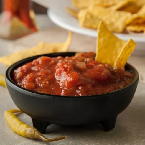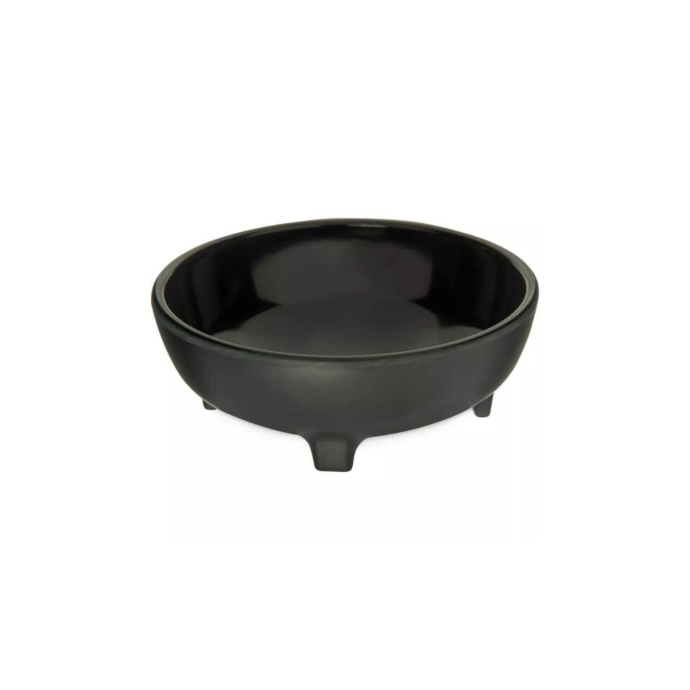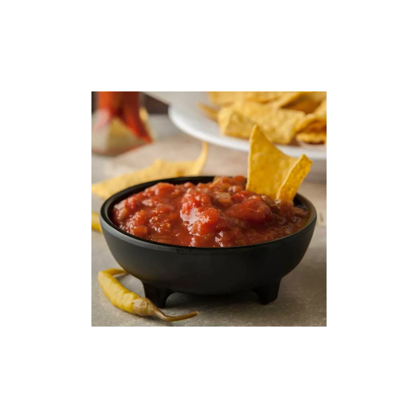 El plato de molcajete Carlisle es ideal para servir 8 onzas de frijoles refritos, queso, salsa, guacamole y más. Los arañazos, astillas y roturas se resisten con la construcción de melamina del recipiente. Tiene capacidades de apilamiento que proporcionan opciones de almacenamiento fáciles. Tres pies en el fondo del tazón lo mantienen resistente. El plato de molcajete viene en negro para combinar con casi cualquier tema.