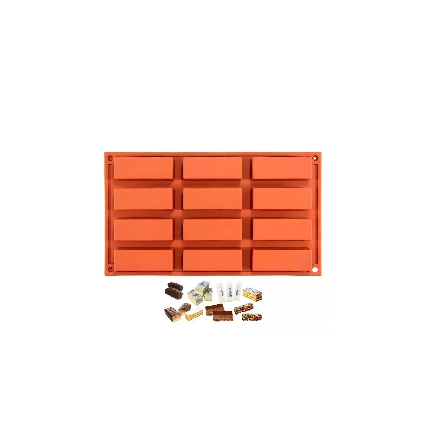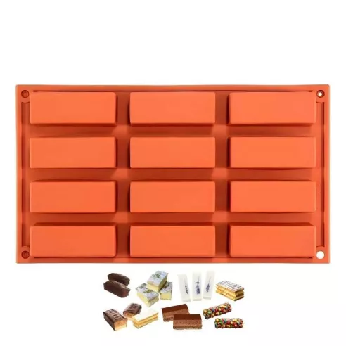 Molde de silicona con 12 cavidades en forma de barras, ideal para barras de chocolate y pastelitos. Color rojo. Son aptos para lavavajillas. Su material en Silicón Antiadherente, es resistente a altas temperaturas. El rango de temperaturas de -40º C hasta 230º C, así que son aptos para congelador y horno. También son aptos para lavavajillas.