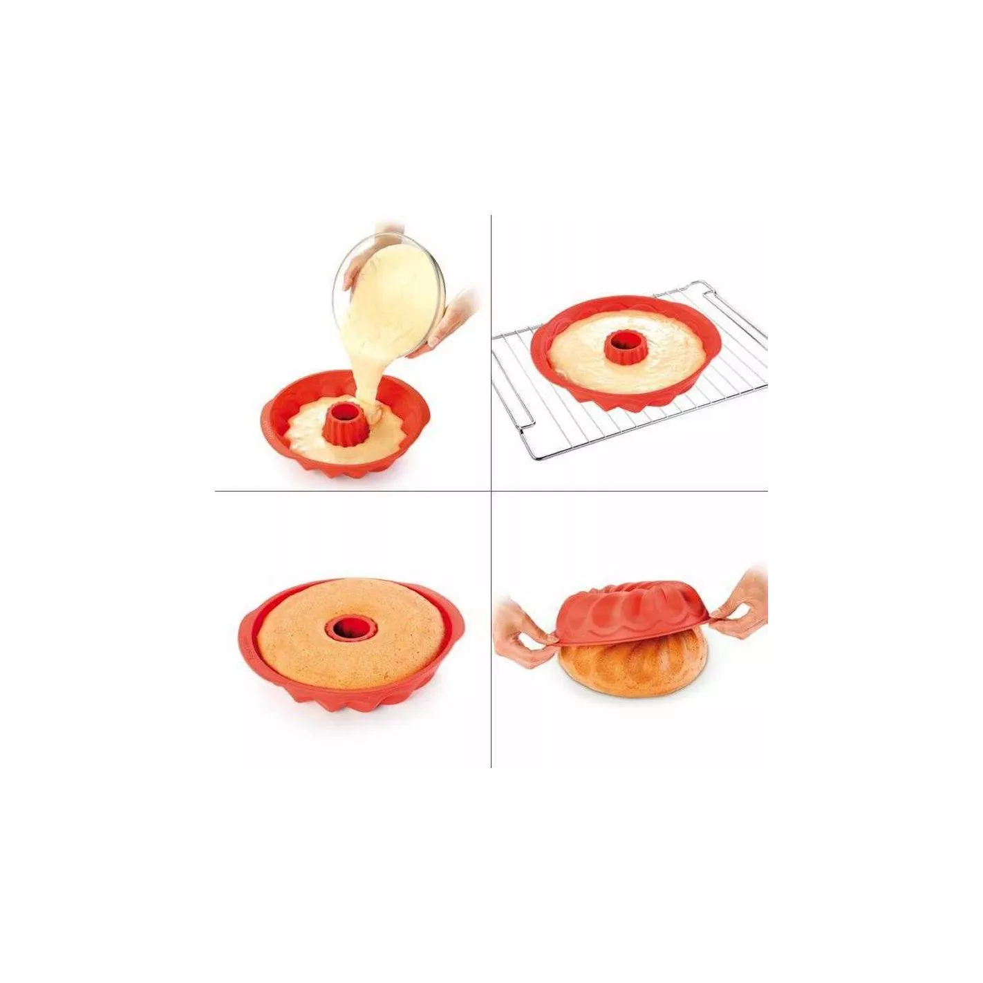 Excelente para preparar pasteles bajos. El molde no se cocina demasiado, se hornea rápida y uniformemente; se puede sacar fácilmente del molde. Hecho de excelente silicón resistente al calor. Resistente hasta 230° C. Los moldes de silicón son fáciles de limpiar, simplemente enjuáguelos o lávelos en el lavavajillas después de usarlos. Perfectamente ahorran espacio. Apto para hornos de gas o eléctricos. Instrucciones de uso con recetas adjuntas.
