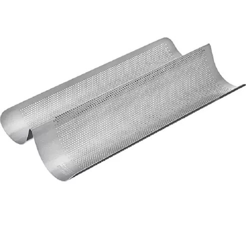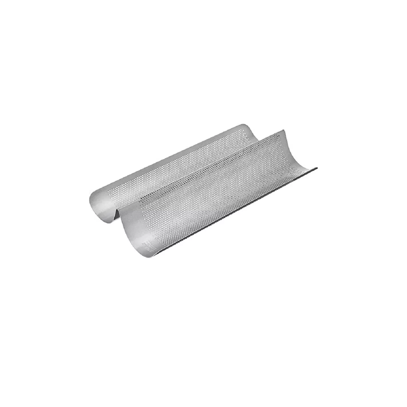 Está hecho de acero al carbono de grado alimenticio y está equipado con 2 canaletas perforadas separadas que están diseñadas para maximizar su eficiencia de cocción. Está recubierto con acero aprobado por la FDA que proporciona una superficie de cocción transparente y antiadherente. Esta superficie antiadherente elimina la necesidad de un engrase previo, al tiempo que proporciona una liberación sin desorden de su masa recién preparada.